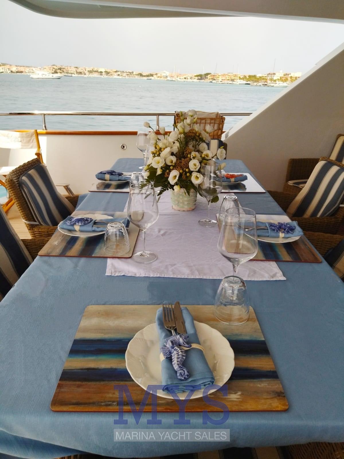 Gli ampi spazi del pozzetto di poppa, con i suoi 7 metri di larghezza, ospitano divani e tavoli che vi consentiranno di gustare le ricche colazioni a bordo o i vostri pranzi e cene in assoluta comodità.