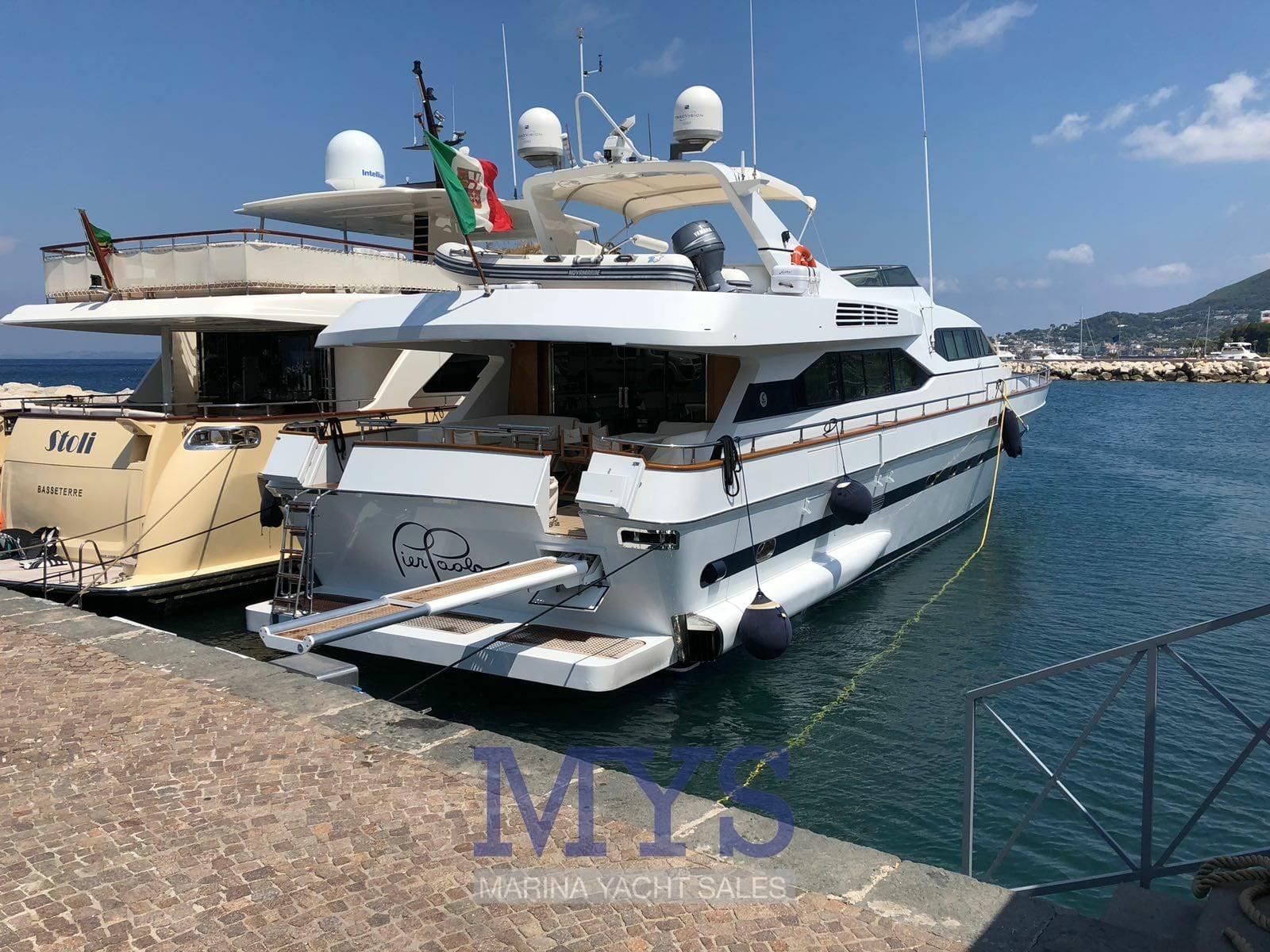 Allarme fumo/gas, Allarme motore, Allarme sentina, 2 Ancora, 2 Autoclave, 3 Autogonfiabile, 8 Batterie, Bocche di Lupa, Camminamenti laterali in teak, 3 Caricabatterie, Cavo corrente di banchina, Corrimano, Doccia esterna, Doppia timoneria, Flap idraulici, Gruette per tender su fly, Impianto antincendio, Impianto Aria Compressa, Indicatori Flaps, Lavaggio catena, Luci di cortesia, Luci subacquee, Motore fuoribordo per tender (40/60), Parabordi, Passerella (idraulica a scomparsa), Piattaforma (Da bagna a poppa), Pompa di Scarico del Serbatoio Acque Reflue, 3 Pompa di sentina automatica, Pompa di sentina manuale, Pompa per Acqua di Mare, Ponte in teak, Porta ingresso, 2 Porta laterale, Pozzetto Teak, Presa 220V banchina (+V 380), Raddrizzatore, Rollbar, Salpa Ancore Idraulico, Scala reale, Scaletta da bagno, Selle per Tender, Tavolo pozzetto, Tender, Tromba, Winch Idraulico, 2 Winch tonneggio di poppa (a scomparsa), 2 Winch tonneggio di prua.