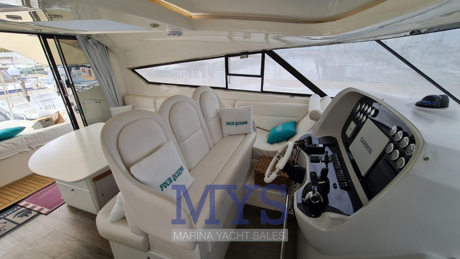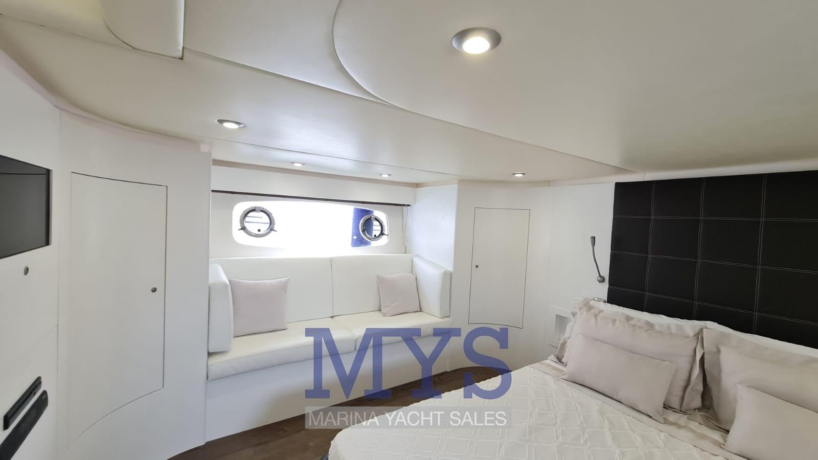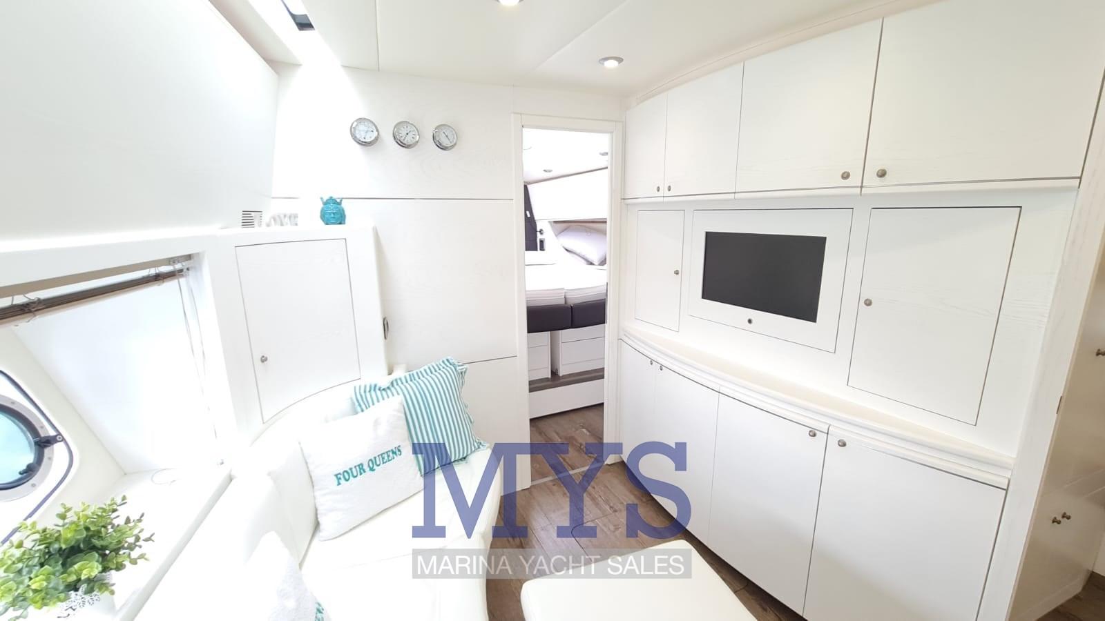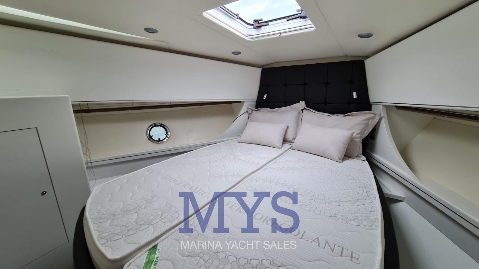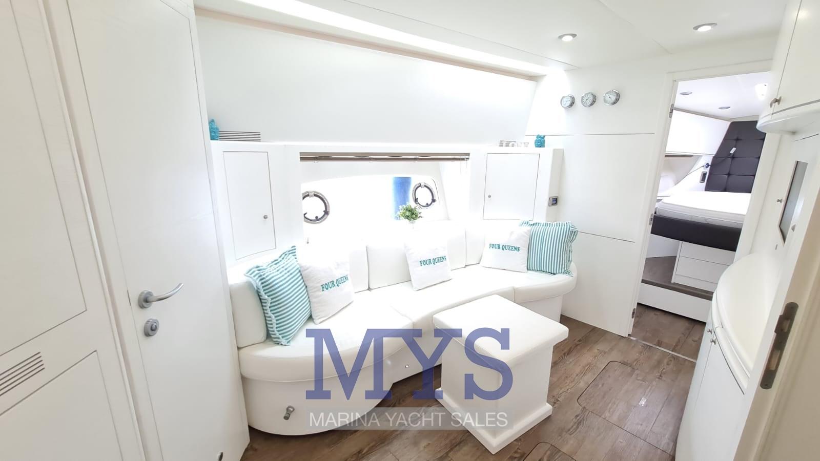 Nella tuga si trovano il grande soggiorno e il posto di pilotaggio. Gli arredi sono caratterizzati da materiali e tessuti pregiati secondo lo stile ormai collaudato sui modelli precedenti.