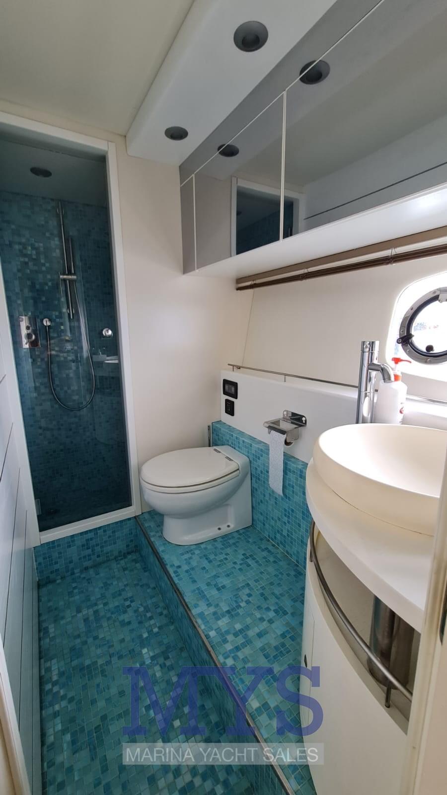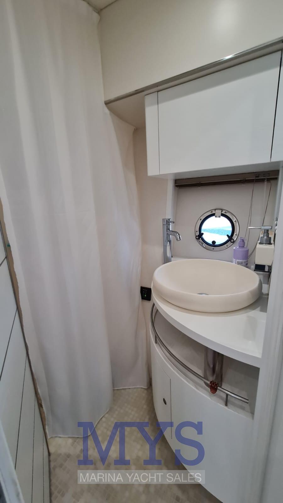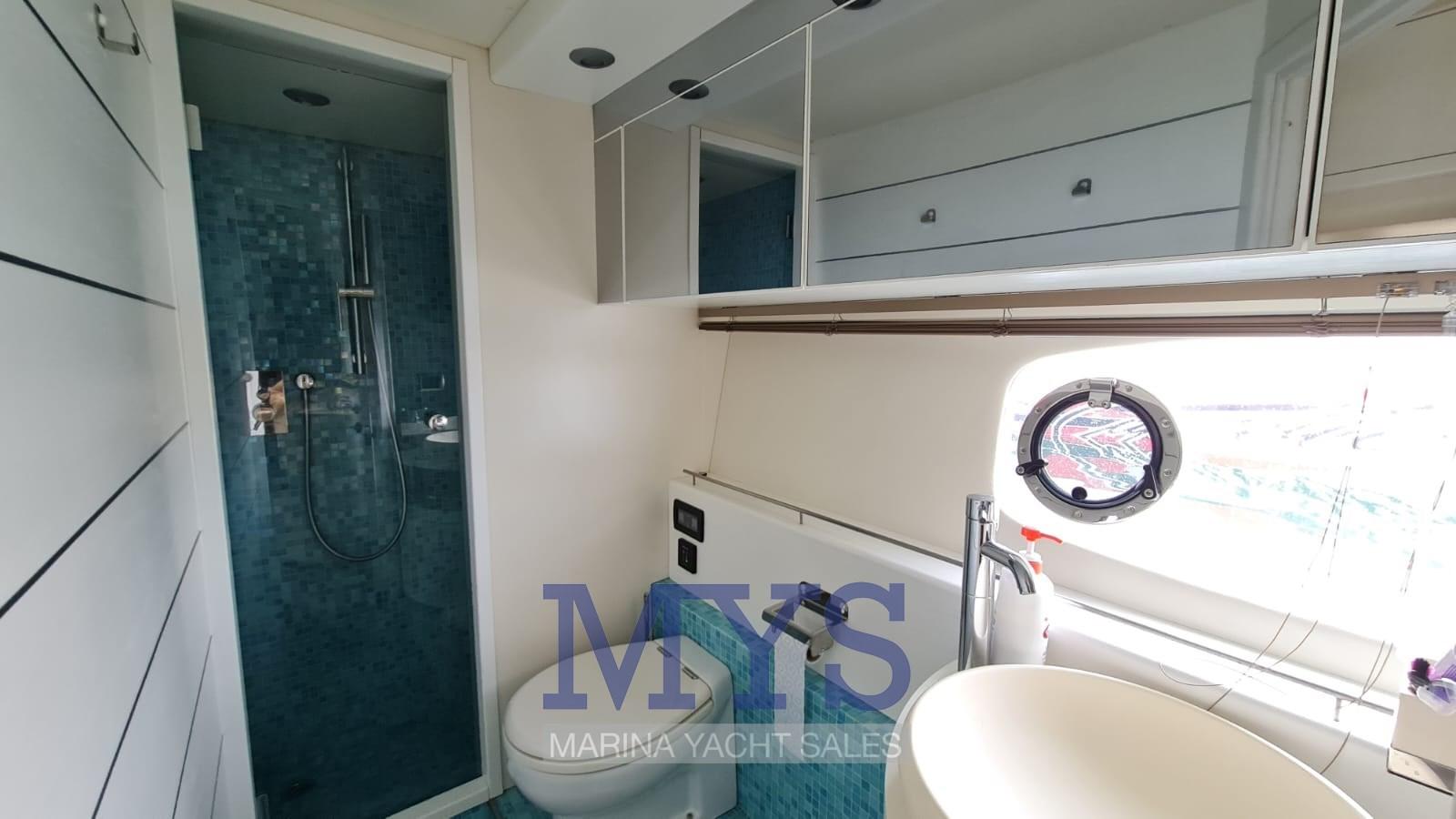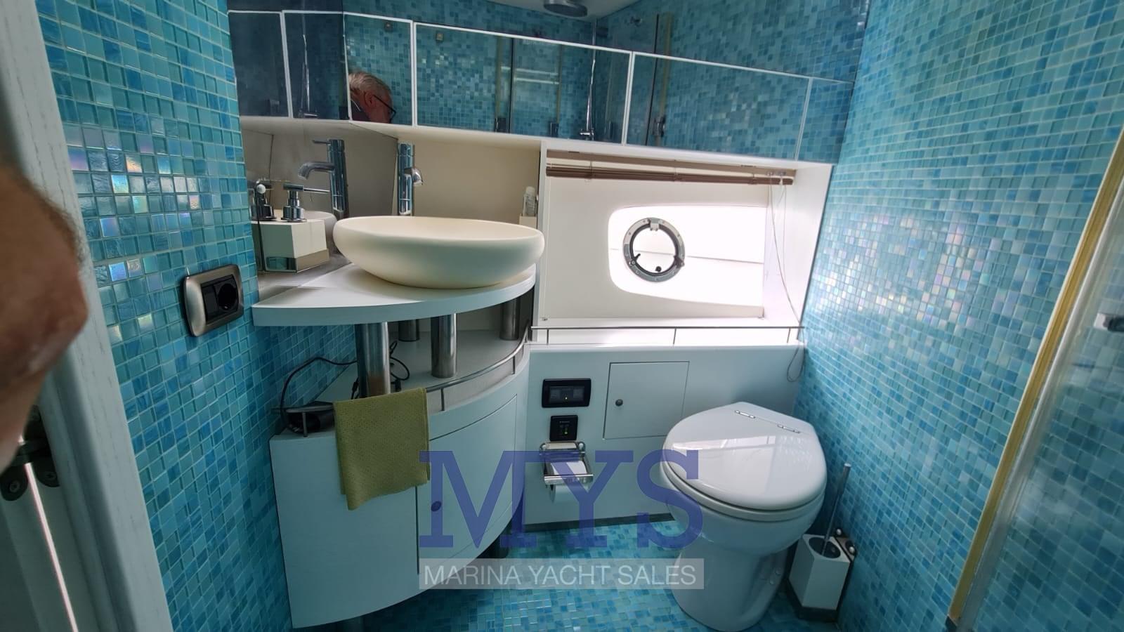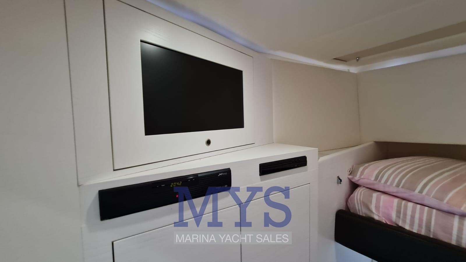 Nella tuga si trovano il grande soggiorno e il posto di pilotaggio. Gli arredi sono caratterizzati da materiali e tessuti pregiati secondo lo stile ormai collaudato sui modelli precedenti.