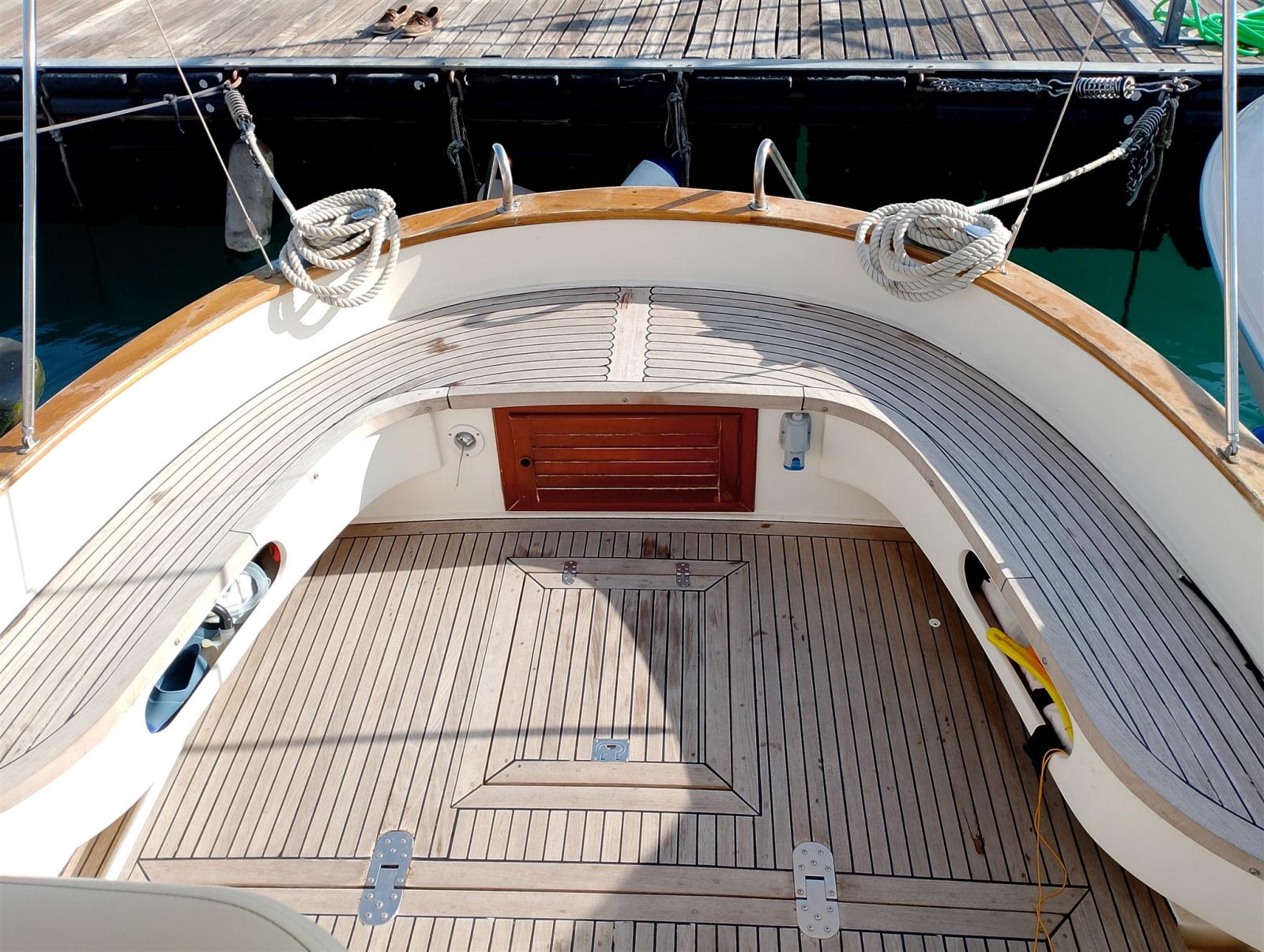 Autoclave, 2 Batterie, Camminamenti laterali in teak, Doccia esterna, Piattaforma (Inox e teak), Pompa di sentina automatica, Porta ingresso, Pozzetto Teak, Presa 220V banchina, Salpa Ancore Elettrico, Scaletta da bagno.