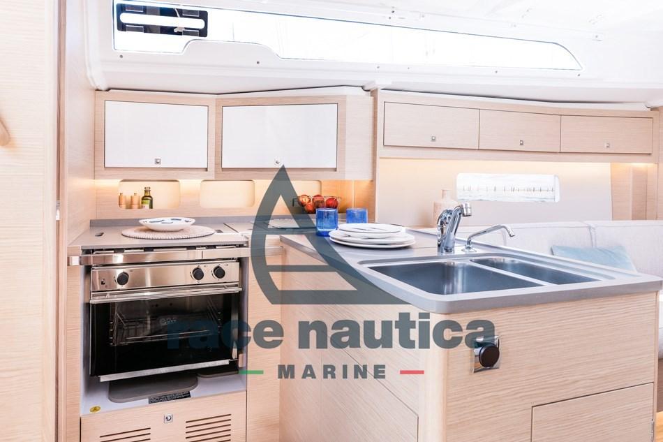 L-shaped galley on the left, black water tank, supplement for 30HP sail drive engine, gas stove with two burners, oven, cockpit shower (hot/cold), additional battery for services, 20-litre boiler, 220V system, shore and boat power socket, 220V sockets in the dinette and 23 amp battery charger, 700W windlass with bow control, cockpit table, roll-up blackout blinds for hatches with mosquito nets, wine rack under the floor in the dinette, rigid vang, lazy bag, lazy jacks, aft platform, 2 T40 winches aft, self-tacking jib track + Genoa control, Dacron Genoa, asymmetrical rigging, German mainsail sheet, 2 Triton navigation stations in the cockpit, one on the left and one on the right, autopilot with NAC 3 rotary motor, VHF V20S, hull preparation + black antifouling, self-tacking jib in Dacron (if you take the Ocean pack) with equipment instead of the Genoa, additional opening porthole in the aft cabin on the right side, additional opening porthole in the aft cabin on the left side, gas hob for cooking in the cockpit and sink, sprayhood with grab rails, grey bimini, anchor with chain and rope, 6 fenders, 3 mooring lines, difference for the entire 50m chain instead of the line, electric WC.