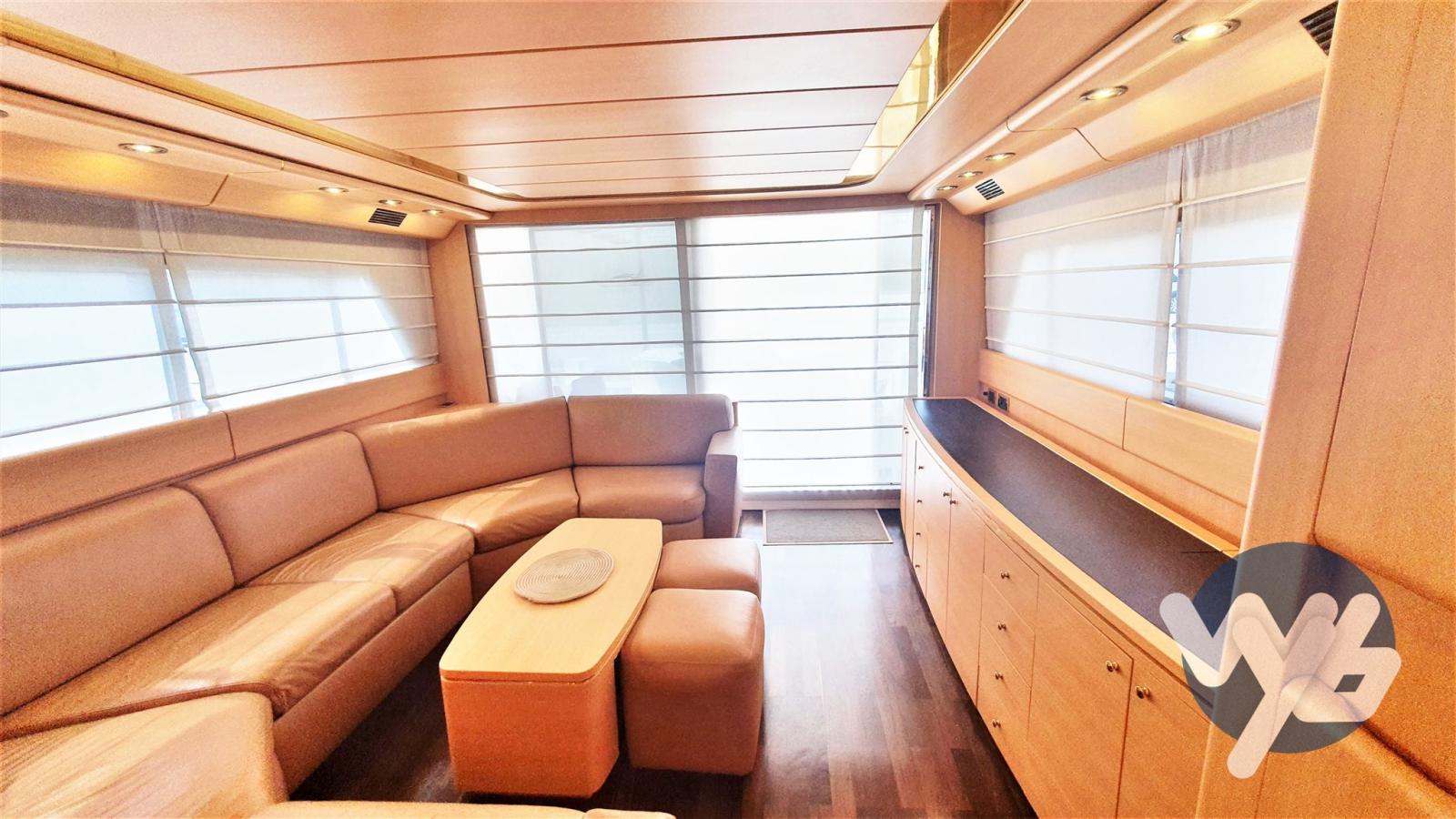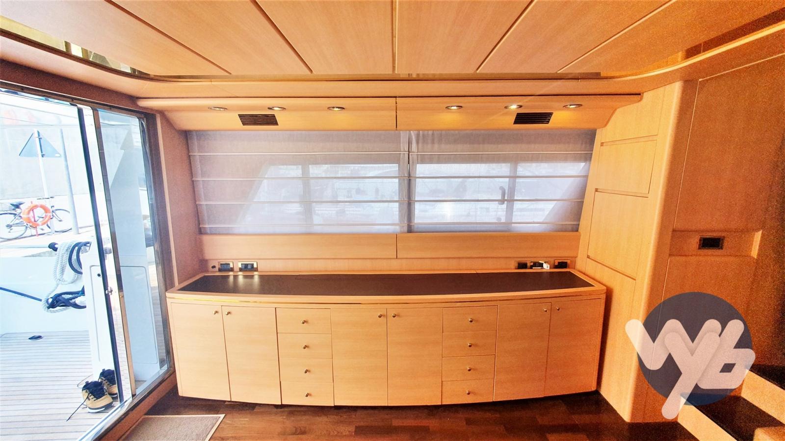 Allarme motore, Allarme sentina, Autoclave, Camminamenti laterali in teak, Doccia esterna, Doppia timoneria, Faro orientabile, Flap idraulici, Gruette per tender su fly, Impianto antincendio, Indicatori Flaps, Motore fuoribordo per tender, Passerella, Pompa di sentina manuale, Porta laterale, Pozzetto Teak, Presa 220V banchina, Presa acqua banchina, Salpa Ancore Elettrico, Scaletta da bagno, Tavolo pozzetto, Tender, Winch tonneggio di poppa, Winch tonneggio di prua.