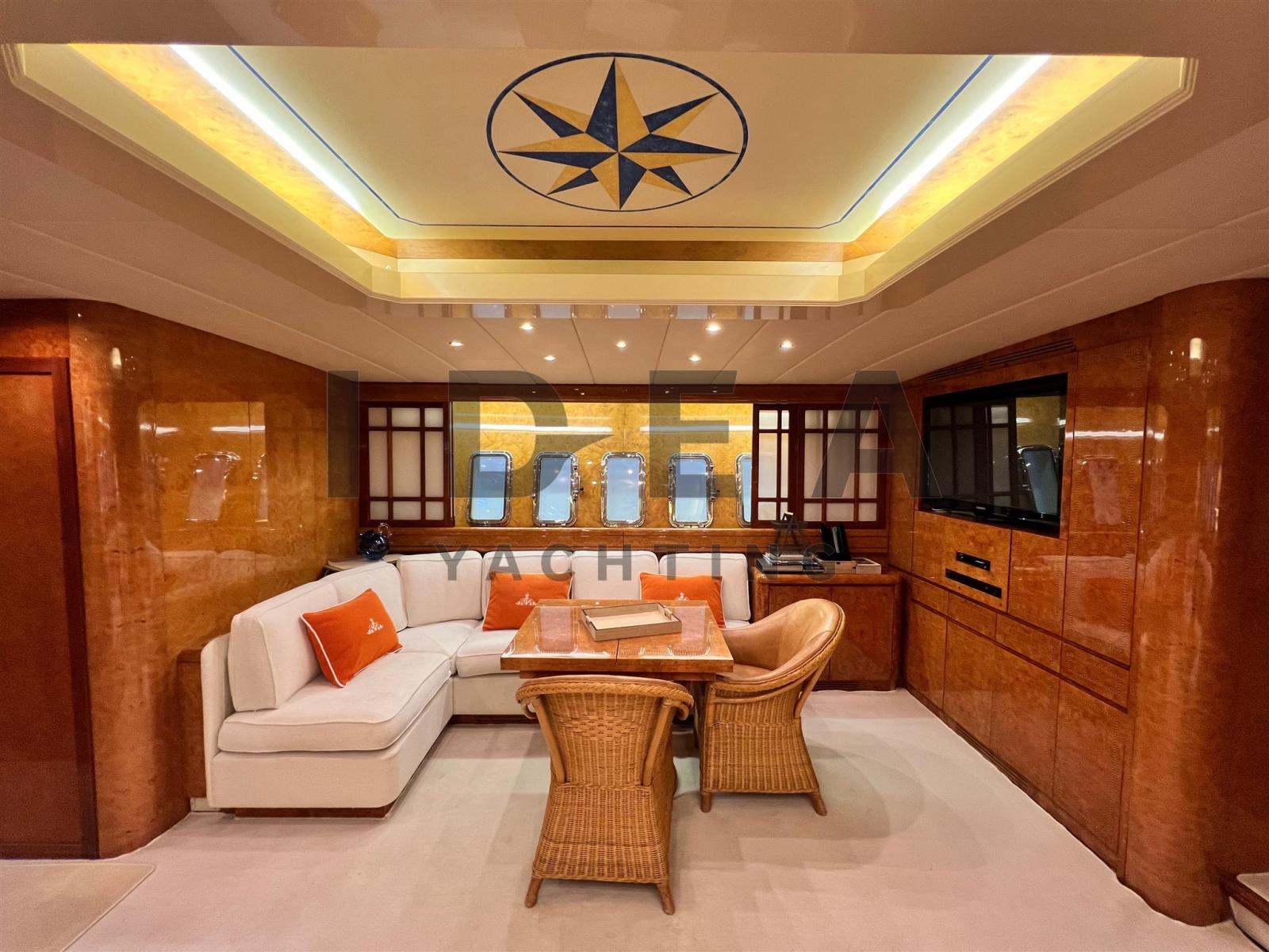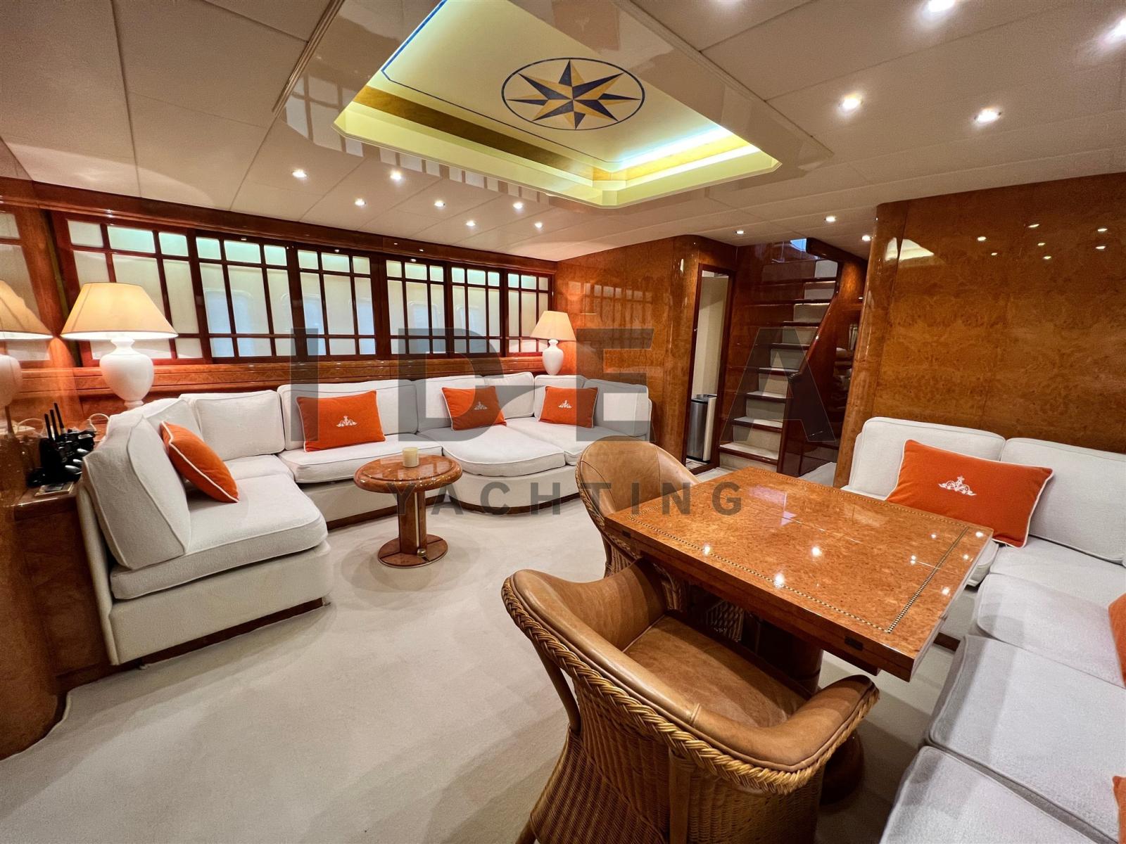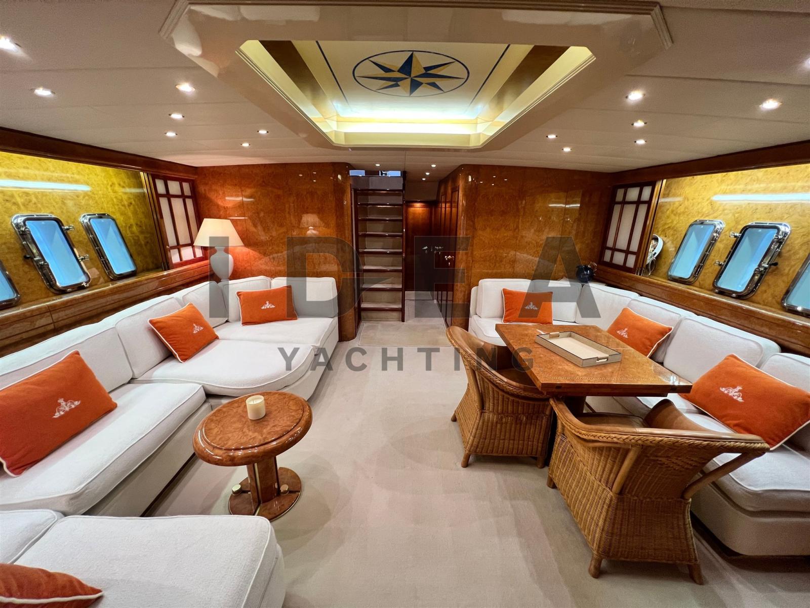 Featuring a meticulously designed layout, this yacht is renowned for its spaciousness and luxurious appeal. Guests are welcomed into a lavish saloon area, complemented by a fully-equipped galley and four indulgent cabins. The meticulous wooden detailing, premium upholstery, and carefully curated decor highlight the vessel's plush quality.