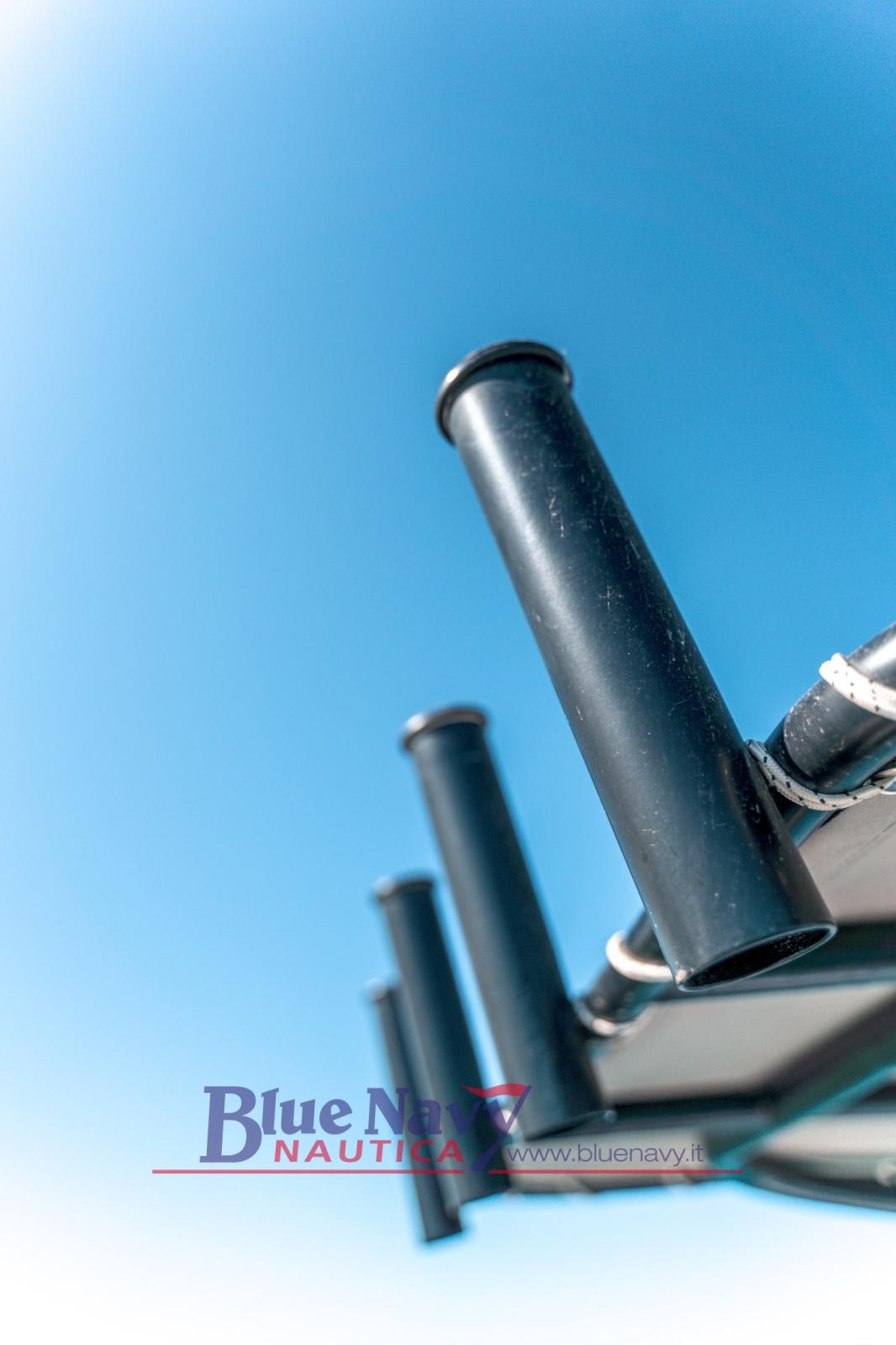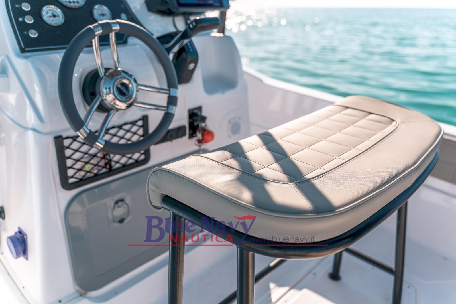 Dotazioni standart: pompa di sentina, luci di navigazione, timoneria meccanica, bitte ormeggio a scomparsa, scaletta di risalita, prendisole di prua, scafo bianco, tappezzeria, serbatoio carburante 105lt, 4 portacanne acciaio, serbatoio acqua dolce 45lt, impianto doccia, presa a mare, innesto rapido pompa, vasca del vivo, vasca del pescato.