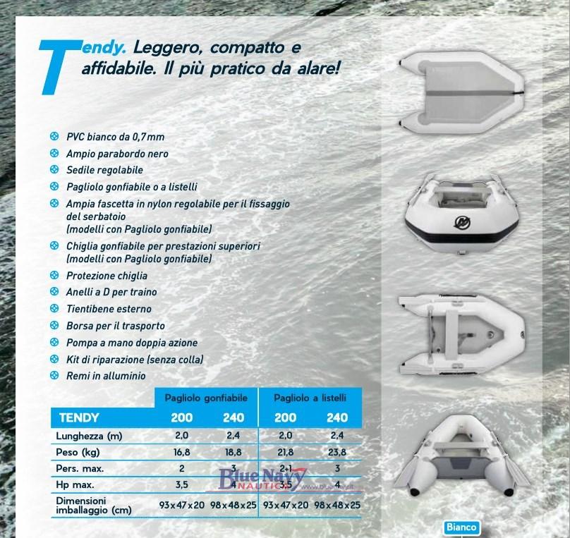 PVC bianco - Ampio parabordo nero, Sedile regolabile - Tientibene esterno, Ampia fascetta in nylon regolabile per il fissaggio del serbatoio, Chiglia gonfiabile per prestazioni superiori, Protezione chiglia, Anelli a D per traino - Pompa manuale, Borsa per il trasporto - Kit di riparazione (senza colla).