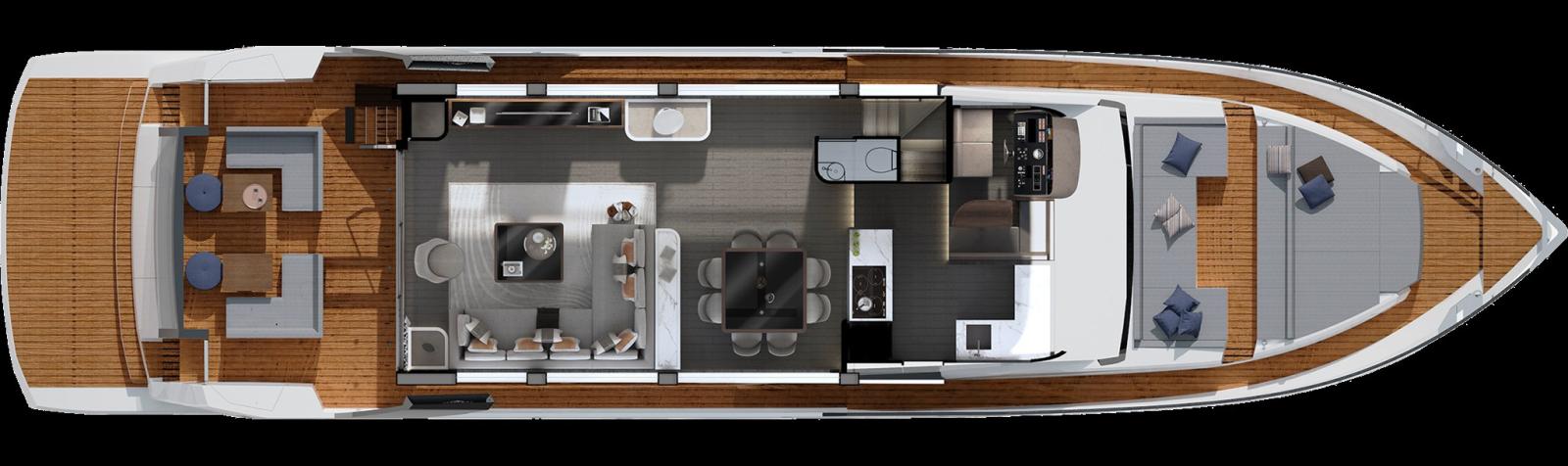 Quattro cabine, quattro bagni sottocoperta e cabina d'equipaggio - Salone, cucina, sala da pranzo, bagno e plancia comando sul ponte di coperta - Decorazione De Luxe standard - Pavimento interno del ponte di coperta in legno - Pavimento delle cabine del sottocoperta in moquette - Elettrodomestici: frigorifero, lavastoviglie, forno/microonde e piano cottura a induzione - Servizi igienici Tecma - Tende del ponte di coperta e del sottocoperta a funzionamento manuale