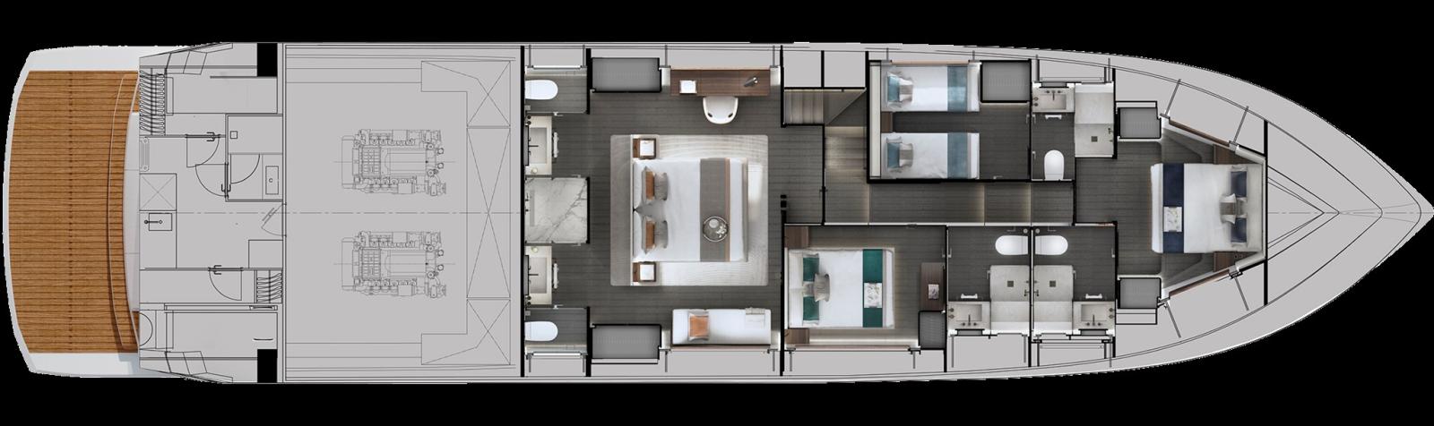 Allarme fumo/gas, Allarme motore, Allarme sentina, Auto Dynamic Trim Interceptor, Autoclave, Auto-Trim, Bitte Abbattibili, Camminamenti laterali in teak, Colorazione speciale, Doccia esterna, Faro orientabile, Flap elettrici, Flap idraulici, Hard top, Impianto antincendio, Lavaggio catena, Luci di cortesia, Luci subacquee, Passerella, Piattaforma, Pompa di sentina automatica, Pompa di sentina manuale, Porta ingresso, Porta laterale, Pozzetto Teak, Presa 220V banchina, Presa acqua banchina, Raddrizzatore, Ripetitore strumentazione, Salpa Ancore Elettrico, Salpa Ancore Manuale, Scaletta da bagno, Stabilizzatori, Tavolo pozzetto, Tientibene con cancelletti, Tromba, Winch, Winch tonneggio di poppa, Winch tonneggio di prua.