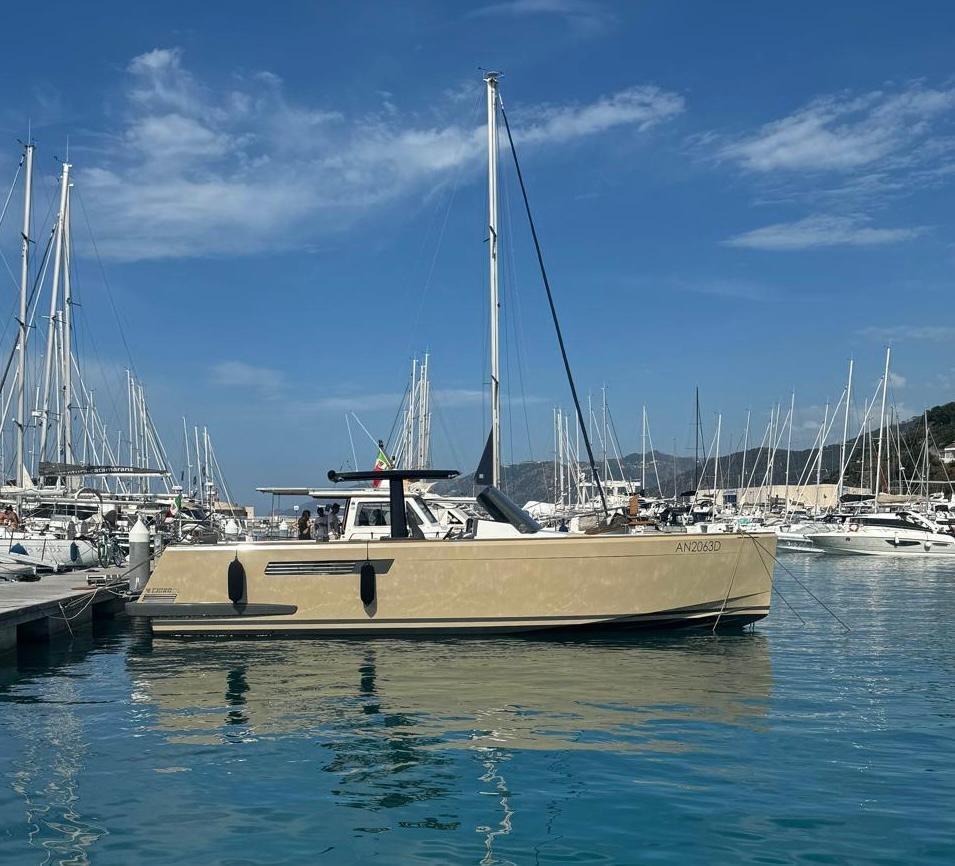 Allarme motore, Allarme sentina, Ancora (10kg + 50m SS chain with hydraulic arm system), Autoclave, 6 Batterie (2x90 Ah (engines) + 4x160 Ah AGM (service)), 6 Bitte Abbattibili, Bocche di Lupa, Camminamenti laterali in teak, Doccia esterna, Flap elettrici (Volvo trim tabs), Impianto antincendio (firebuoy), Indicatori Flaps, Lavandino nel Pozzetto, Luci di cortesia ((Option)), Luci subacquee ((Option)), Piattaforma (extended and fixed), 2 Pompa di sentina automatica, Porta ingresso (sliding), Pozzetto Teak, Presa 220V banchina, Salpa Ancore Elettrico, Scaletta da bagno, Tavolo pozzetto (on electric pedestal convetible into sunpad), 2 Tientibene con cancelletti, Tromba, T-Top (painted Jet black).