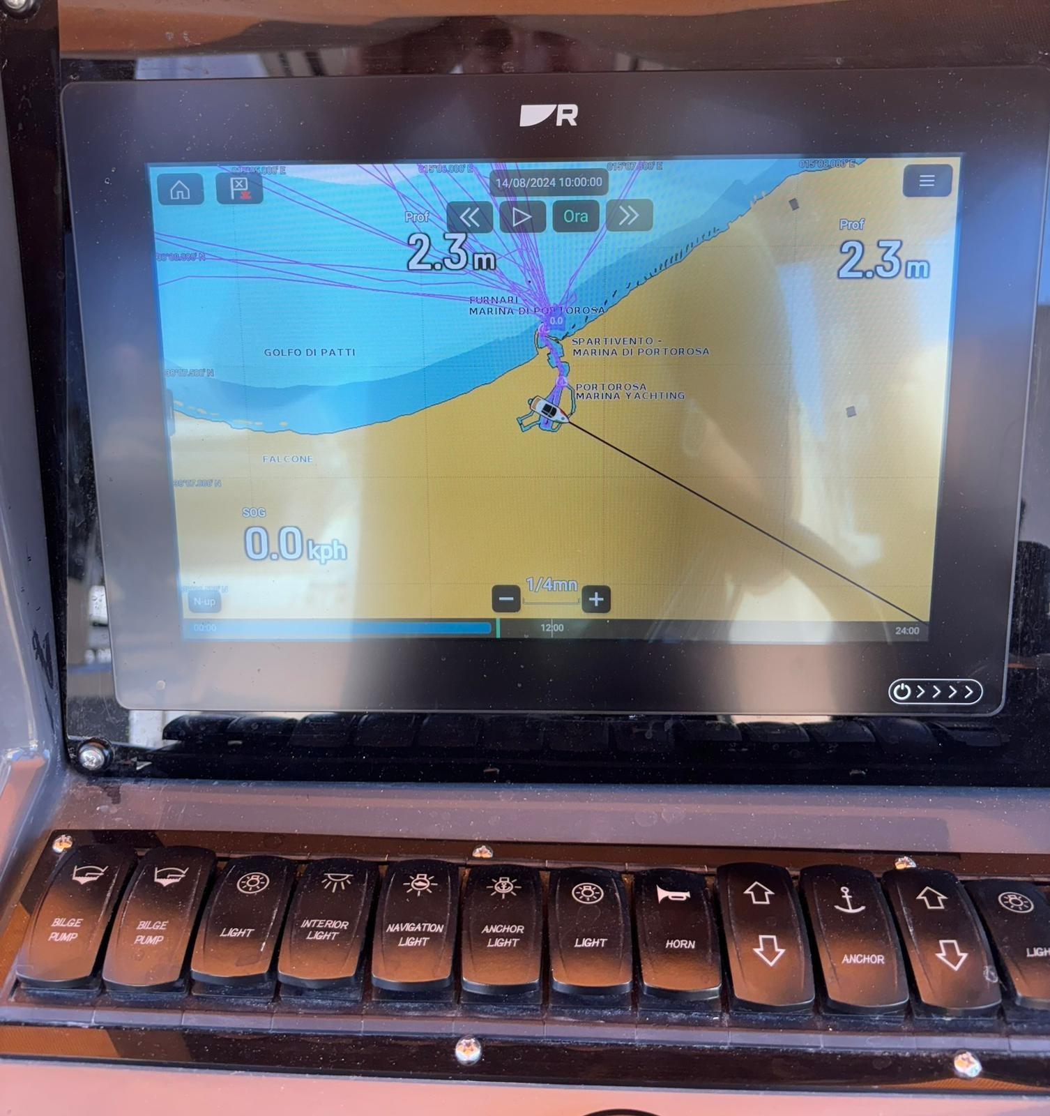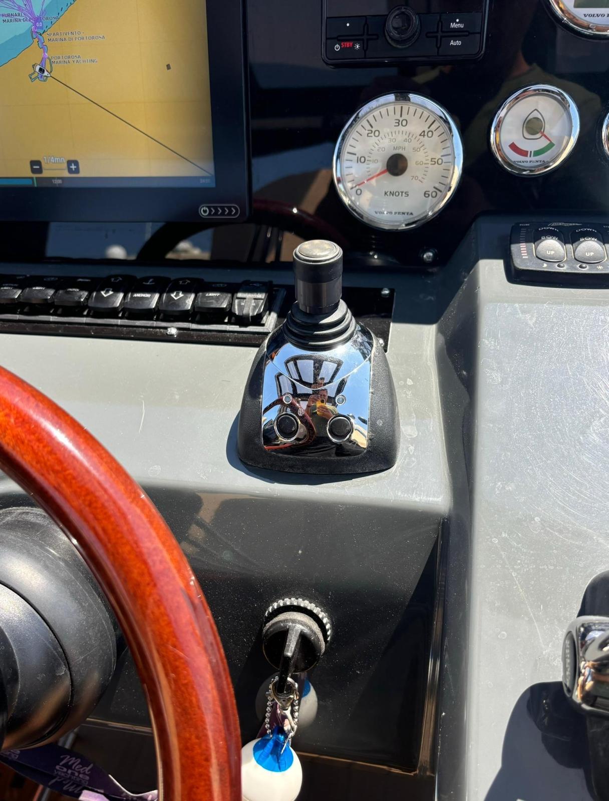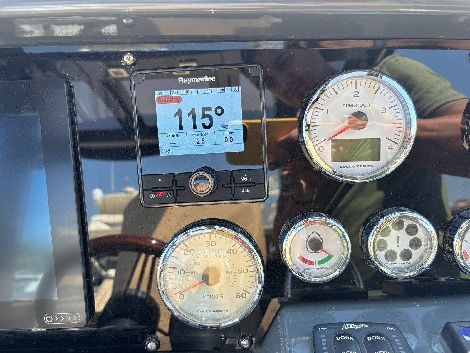 Angolo barra, Comando motori elettronico (Volvo EVC + 2x 2,5" engines displays), Contametri catena ((Option) Quick), Display ((Option) Volvo Trip Computer 7"), DSC vhf (Raymarine 260), Joystick, Pilota automatico ((Option) Raymarine Evolution), Plotter (Raymarine GS125), 2 Sedile Copilota.