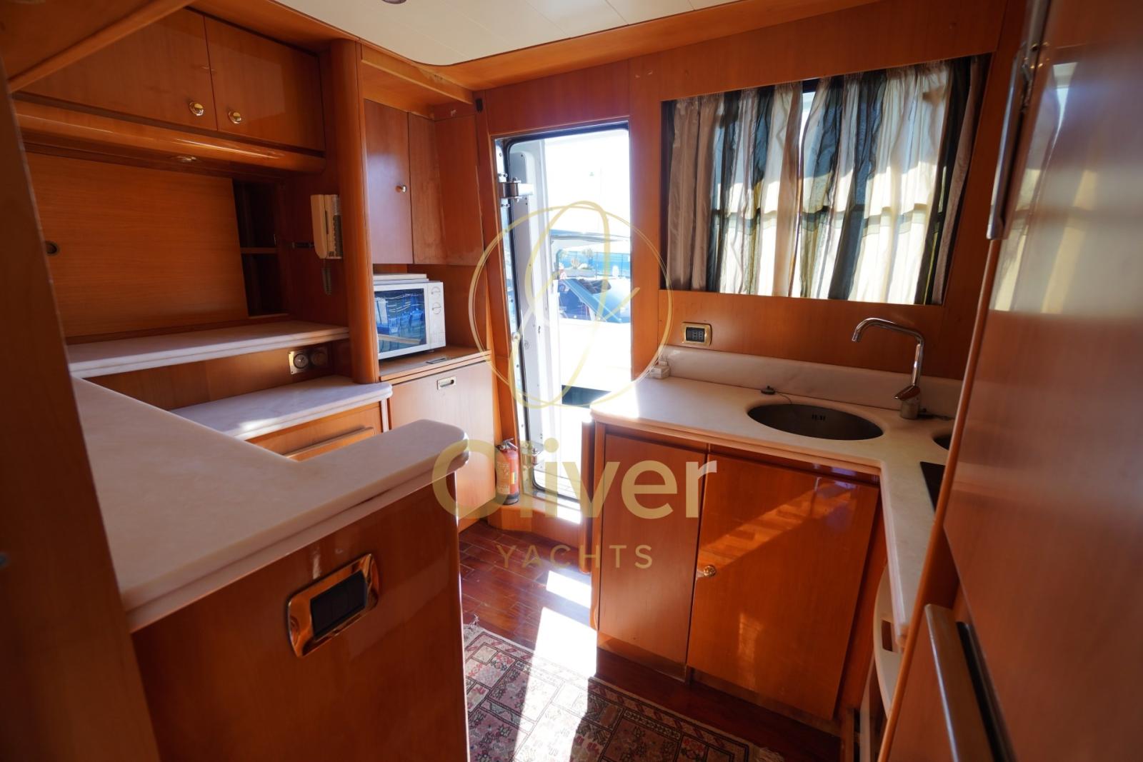 Sulla dritta, separata dalla sala da pranzo da una porta e con accesso al camminamento, si trova la cucina. La cucina è dotata di tutti i comfort moderni, tra cui un fornello a induzione, un forno, un doppio frigorifero e un grande congelatore, un forno a microonde, una lavastoviglie e un monta vivande per il fly.