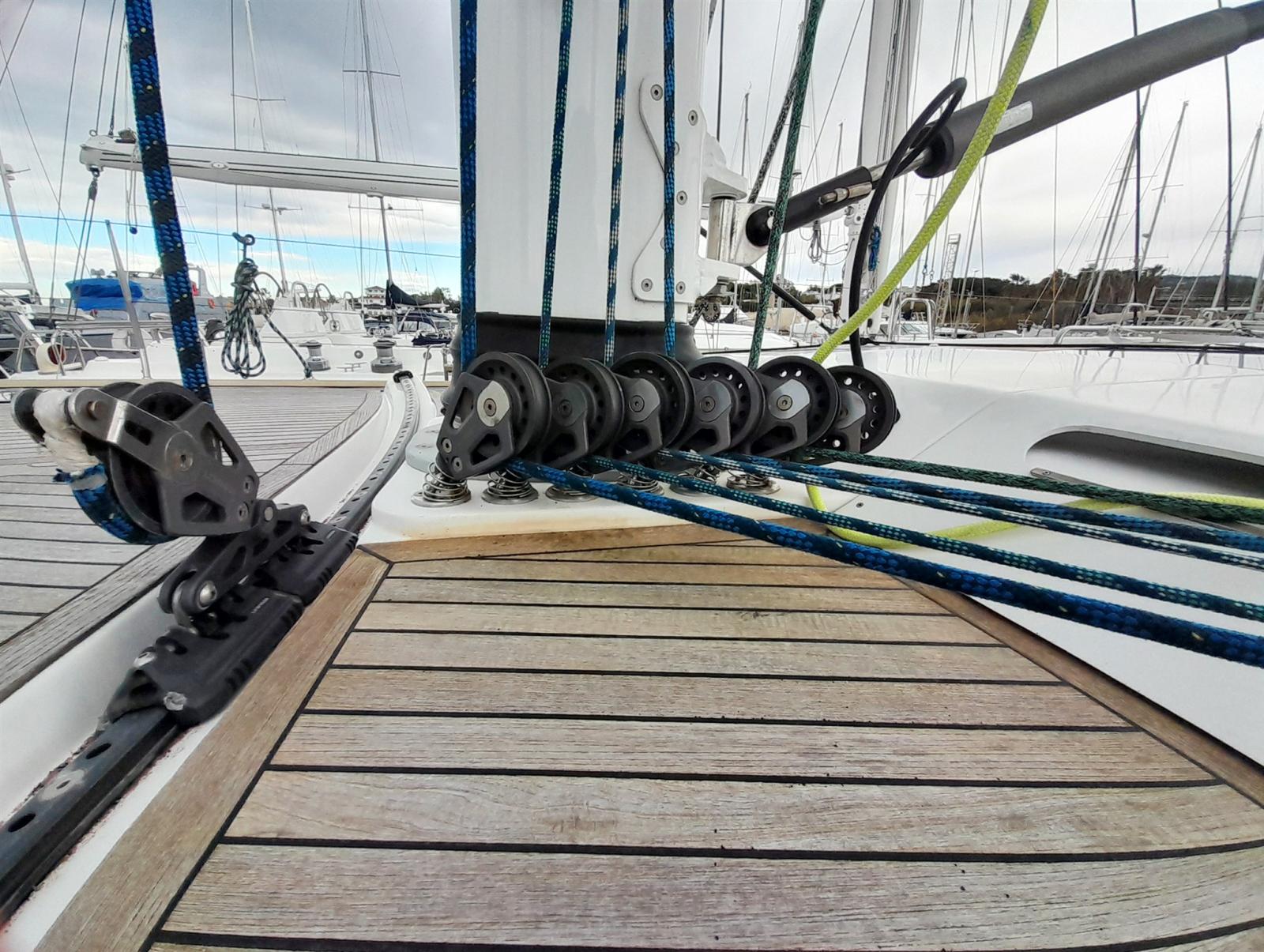 Camminamenti laterali in teak, Doccia esterna, Doppia timoneria, Garage per tender, Luci subacquee, Passerella (Idraulica), Piattaforma (idraulica con telecomando), Pompa di sentina manuale, Pozzetto Teak, Salpa Ancore Elettrico, Scaletta da bagno, Tavolo pozzetto, Tender, 6 Winch Elettrico.