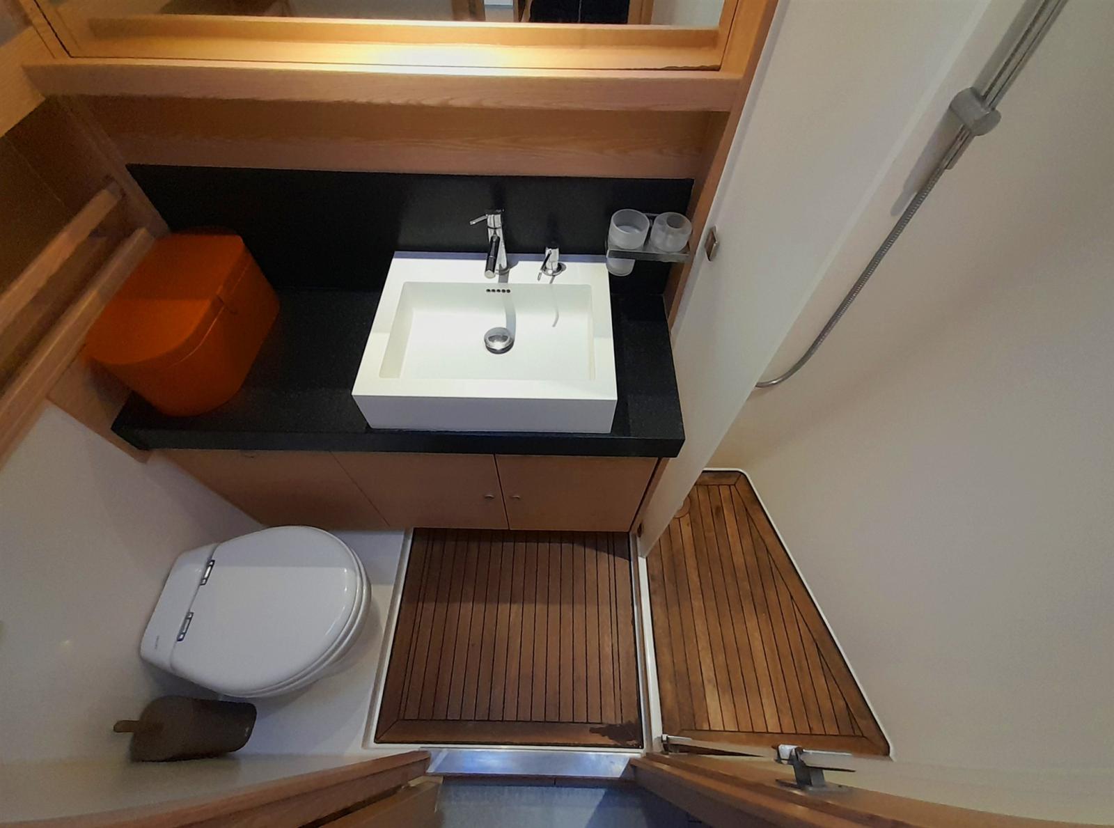 Cabina armatoriale a prua con bagno privato con doccia separata.