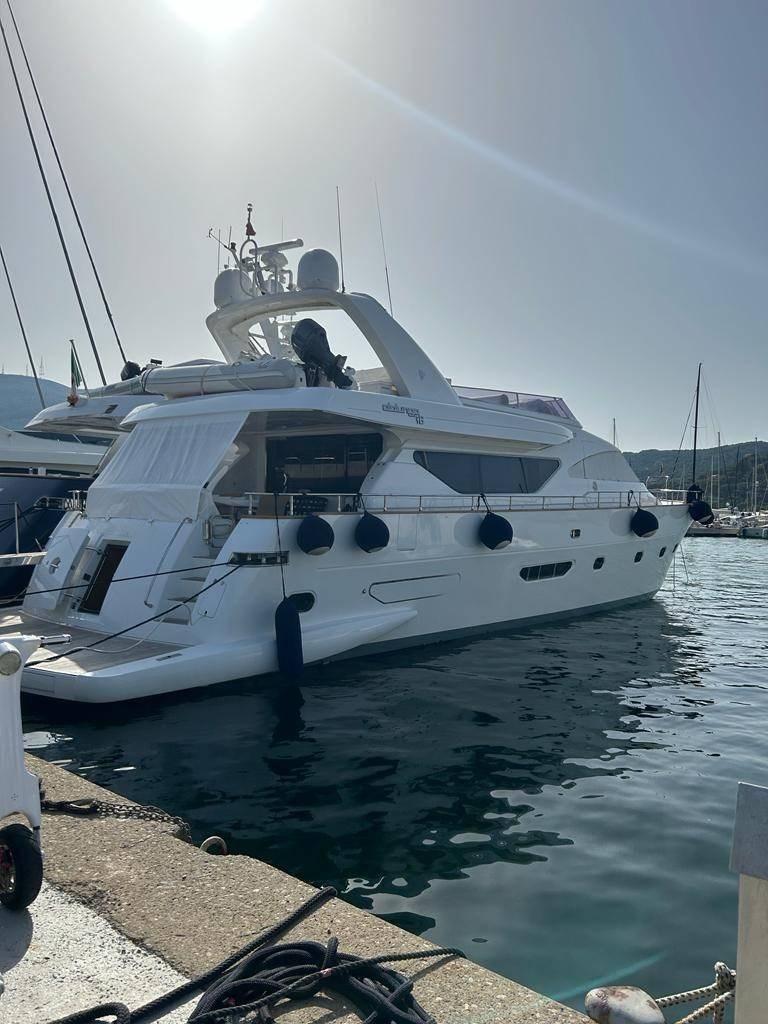 Allarme fumo/gas, Allarme motore, Allarme sentina, Autoclave, Auto-Trim, Bocche di Lupa, Camminamenti laterali in teak, Doccia esterna, Doppia timoneria, Faro orientabile, Flap elettrici, Gruette (Gruetta Fly), Impianto antincendio, Indicatori Flaps, Lavaggio catena, Passerella, Piattaforma, Pompa di sentina automatica, Pompa di sentina manuale, Porta ingresso, Porta laterale, Pozzetto Teak, Presa 220V banchina, Presa acqua banchina, Raddrizzatore, Rollbar, Salpa Ancore Elettrico, Salpa Ancore Manuale, Scaletta da bagno, Selle per Tender, Sistema Depurazione acque nere, Tavolo pozzetto, Tender (Zodiak 420), Tientibene con cancelletti, Tromba, Winch tonneggio di poppa.