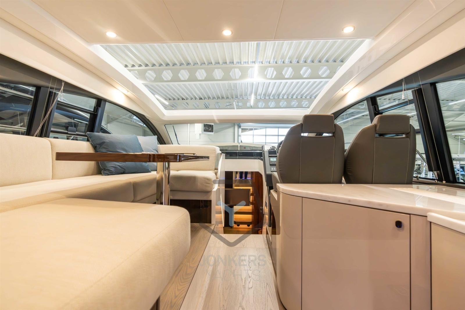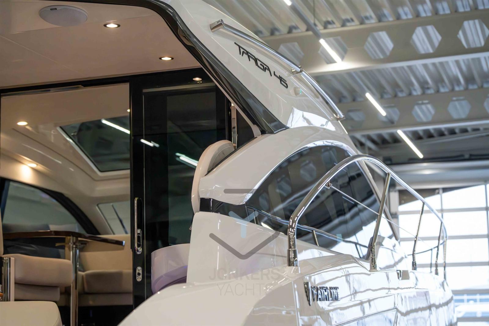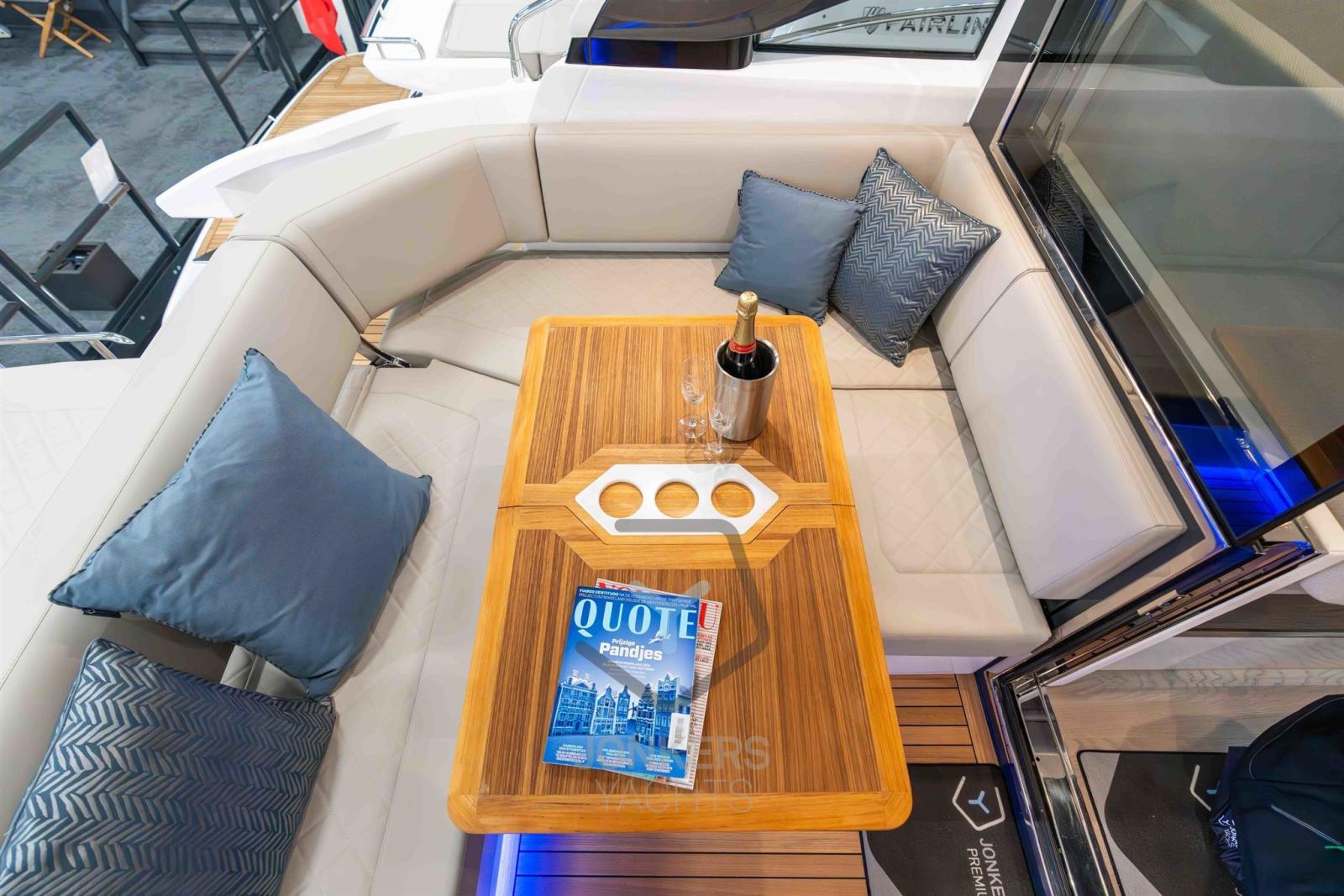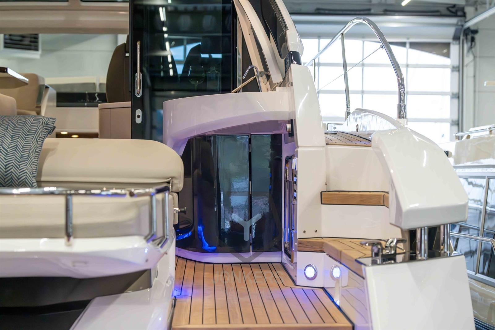 Il relax è ovunque; Sdraiati sugli ampi lettini sia sul ponte di poppa che sul ponte di prua o rilassati nel pozzetto. Riparati dal caldo pomeridiano sotto l'elegante tettuccio rigido o fai scorrere indietro il tetto in tela azionato elettricamente con la semplice pressione di un pulsante.