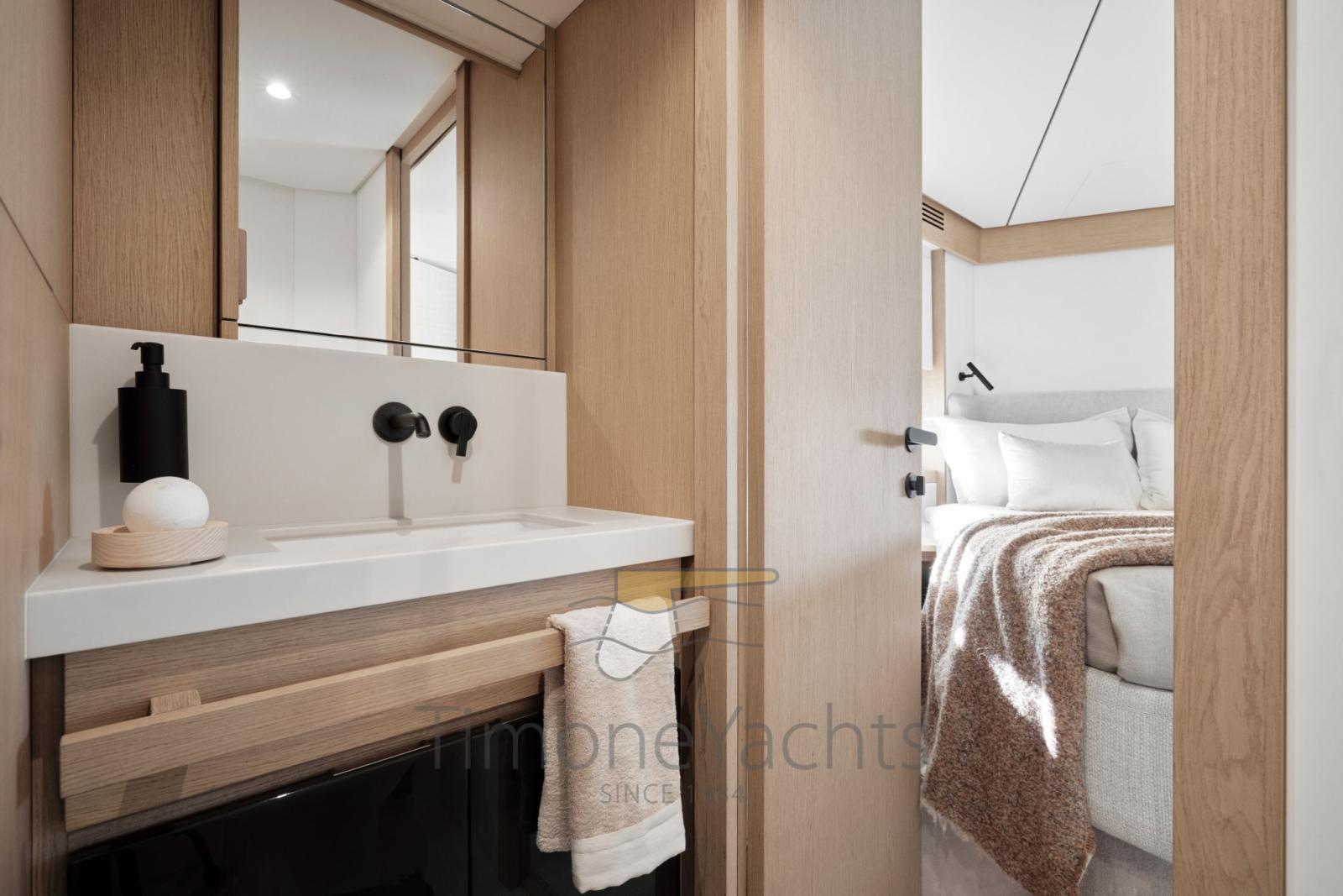 Per creare una sensazione di ampiezza e di grande intimità con il mare, l'architetto Fantolino ha scelto per il salone colori e linee morbidi, come quelle delle sedute. La galley, invece, si distingue per le linee rette e pulite, in un contrasto che rende lo spazio interessante e contemporaneo.