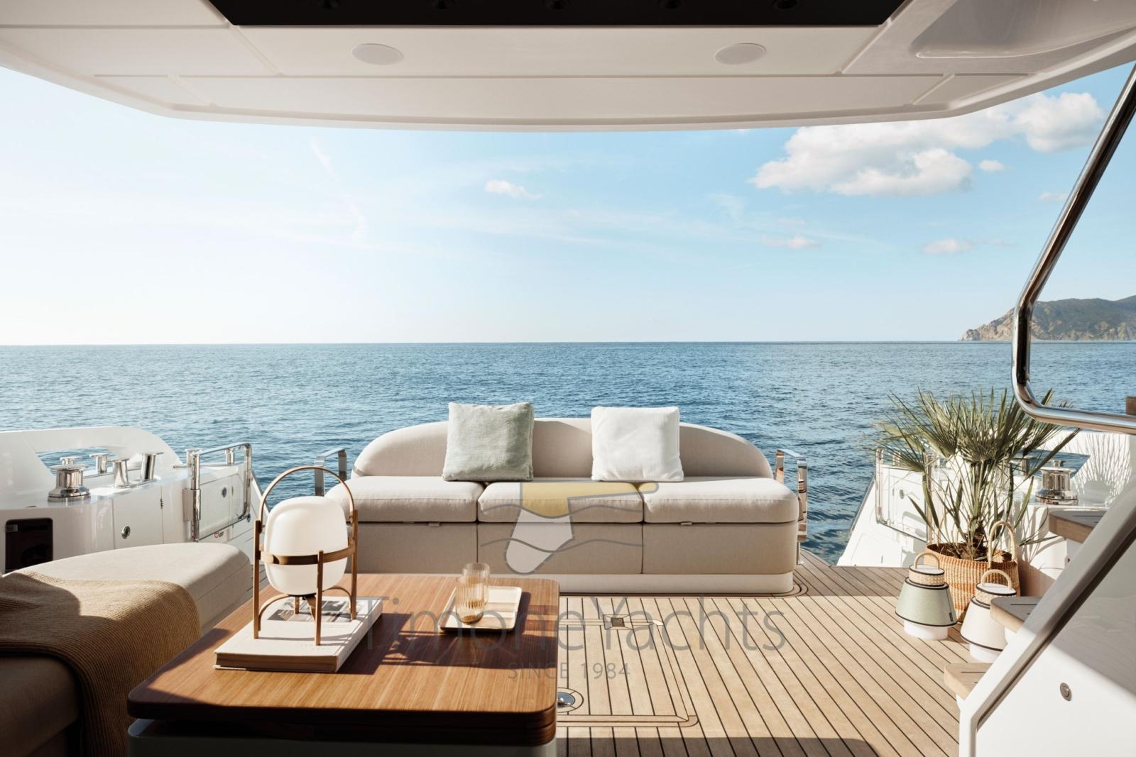 Lo specchio di poppa del Fly 62 si apre verso l'esterno e con un movimento sincrono i divano si abbassa, eliminando qualsiasi barriera fisica e creando un'ampia zona prendisole a poca distanza dall'acqua, il Beach Cockpit.