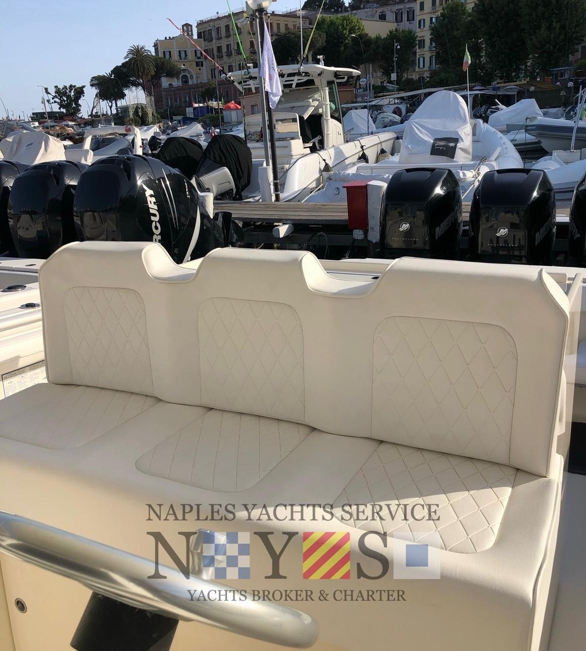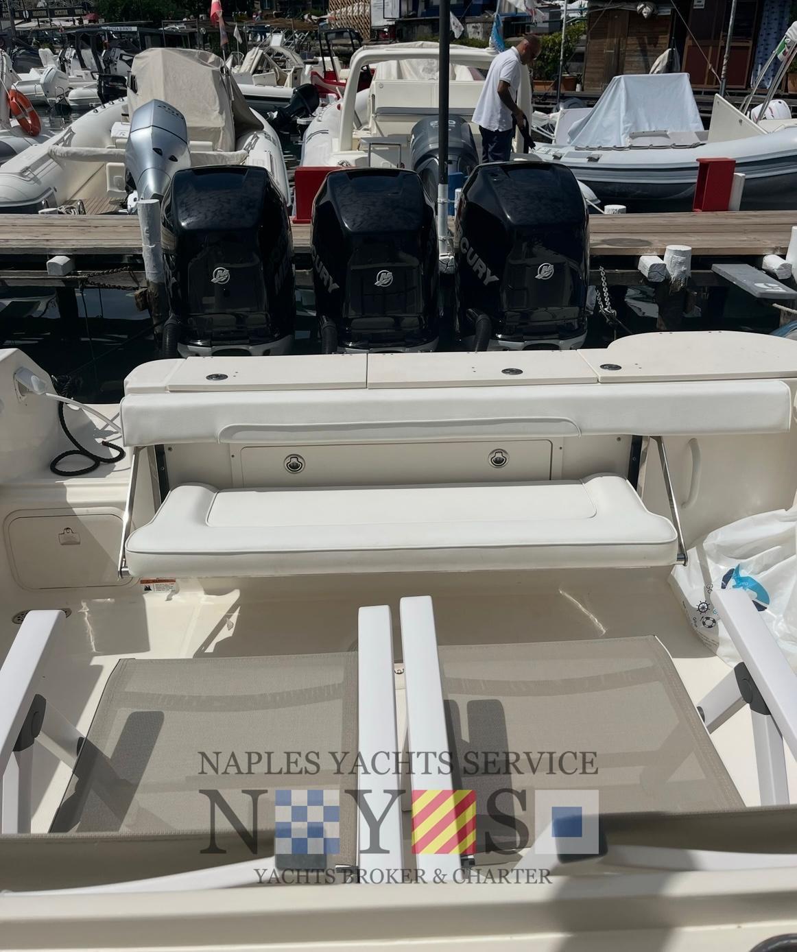 Allarme motore, Allarme sentina, 2 Batterie, 4 Bitte Abbattibili, Caricabatterie (Shore 1 nd/ Shore 2), Doccia esterna, Elica di prua - bow thruster (Quick TCD), Flap idraulici (Impianto 2024), Indicatori Flaps, Lavandino nel Pozzetto, 4 Luci di cortesia (+ Faro poppa fisso), Pompa di sentina automatica, Porta ingresso (In pozzetto), Presa 220V banchina, Raddrizzatore, Salpa Ancore Elettrico, Scaletta da bagno, T-Top (Versione Tournament Plus Bianco).