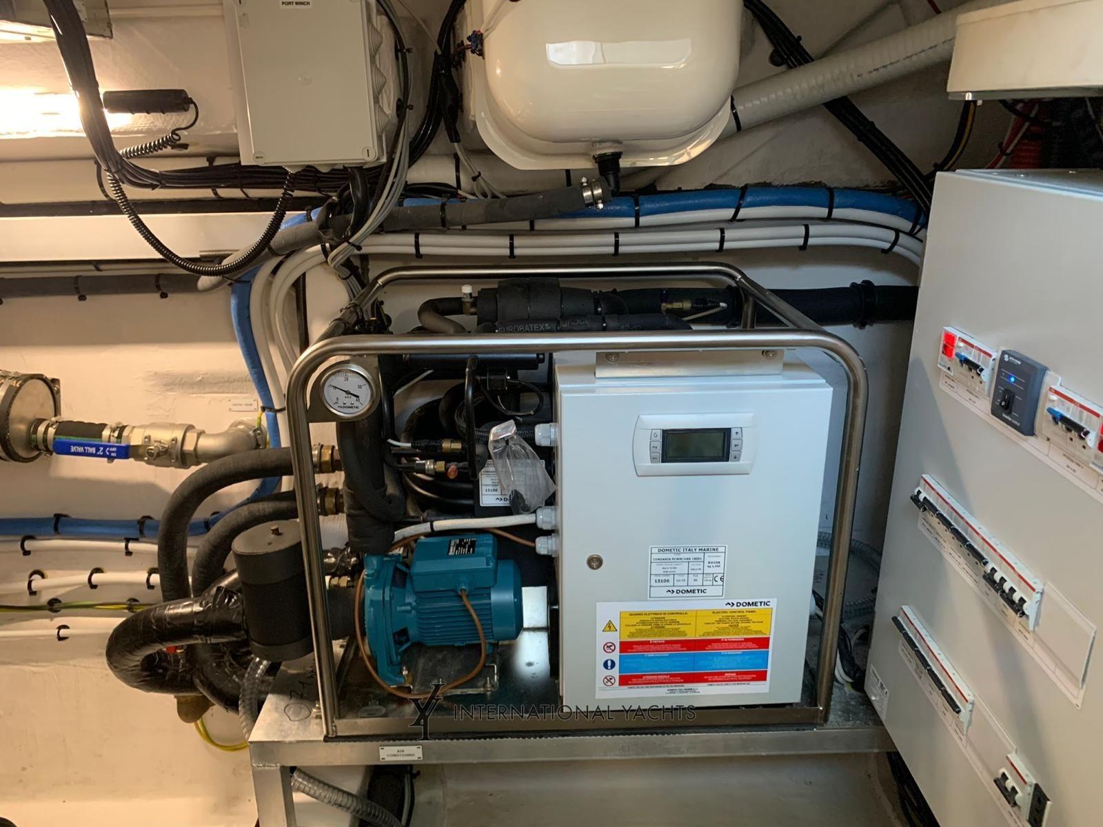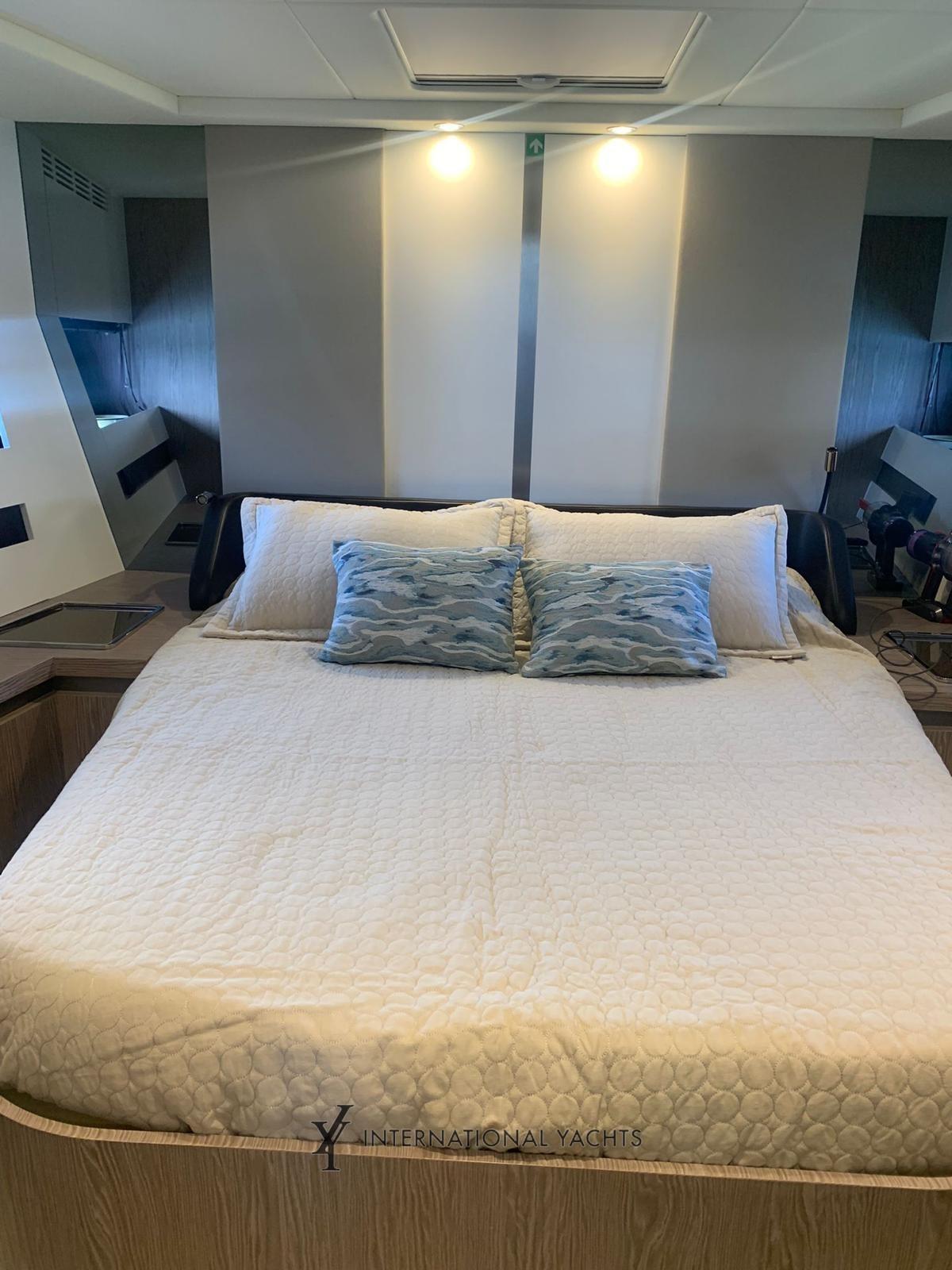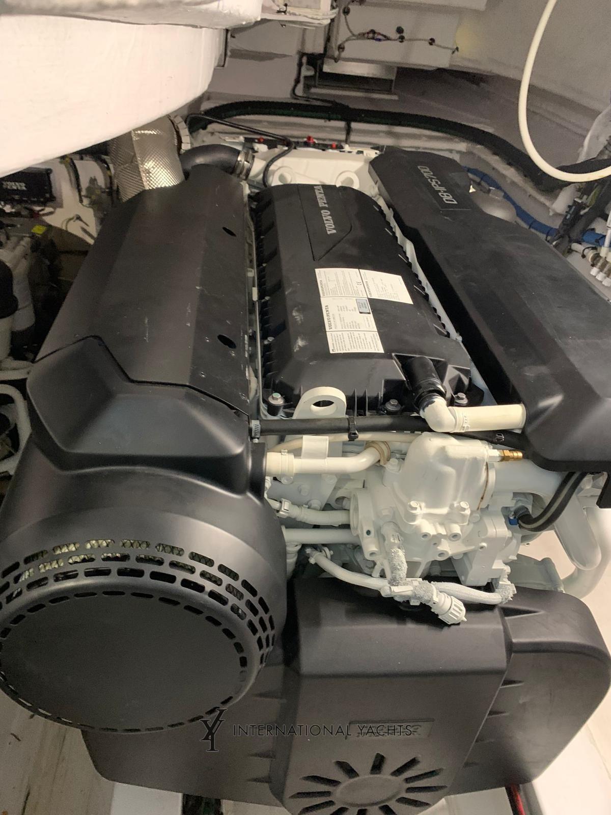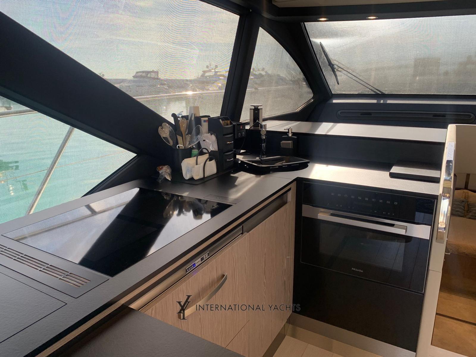 Air conditioning (72000BTU), Bimini (On flybridge and bow with carbon poles), Kitchen (Miele induction), Complete cushions (In Batyline), Bow cushions (In Batyline), Oven (Miele), 2 External refrigerator (In cockpit and on flybridge), Blinds (Electric awning for lounge roof), Internal wooden floor (Lounge, dinette and stairwell), Window covers, Electric awning (Sunshade in cockpit with inverter), manual marine toilet (Tecman with integrated bidet), Mosquito nets (Porthole), Volvo Interceptor system; Racor Filters for Generator; Double Racor filters; Predisposition for desalinator; Additional electrical ducts; Galvanic isolator; Cabinet in the cockpit with refrigerator, barbecue and sink; Folding backrest for fly sundeck; Fixed roof with glass inserts; Up and down system for living room TV; Anchor (Steel), Chain counter (With controls on the bridge), 3 Displays (Raymarine Axiom+ 12), Bow thruster - bow thruster (6.5 kw), 6 Fixed lights at the stern, Adjustable light (Electric), Garage for tender (System hauling), Joystick, 2 Underwater lights, Gangway (Retractable), Platform (Teak), 2 Side doors, Dock water connection, VHF Radio (Ray 90), Co-pilot Seat, Cockpit Table (With carbon top), Folding Salon Table, 2 Electric Winch.