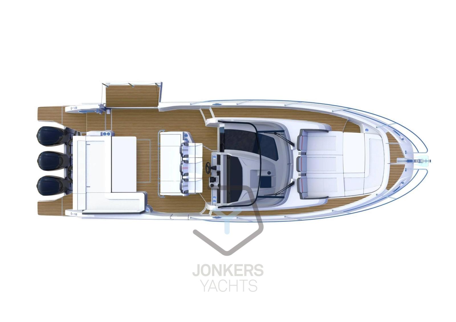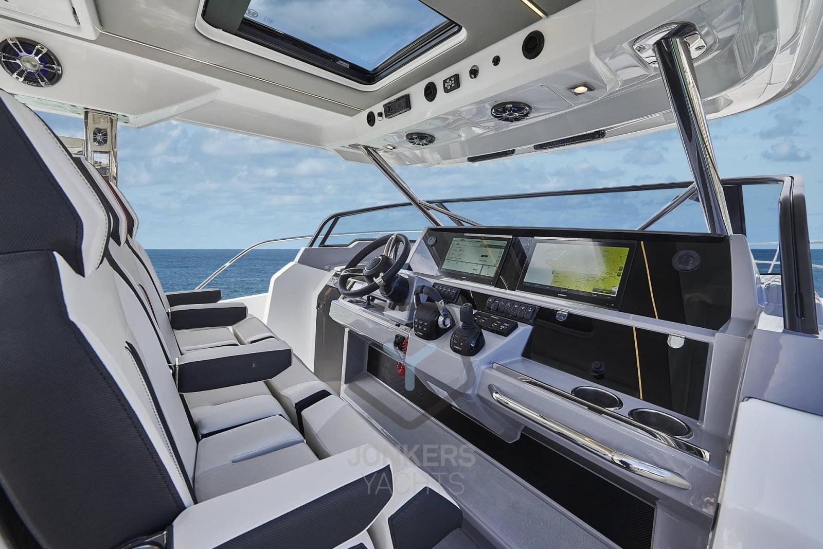 Una lunghezza massima di 11,90 m e una larghezza massima di 3,58 m offrono spazi abitativi ben definiti e un'ergonomia perfetta in un nuovo approccio alla nautica fuoribordo.