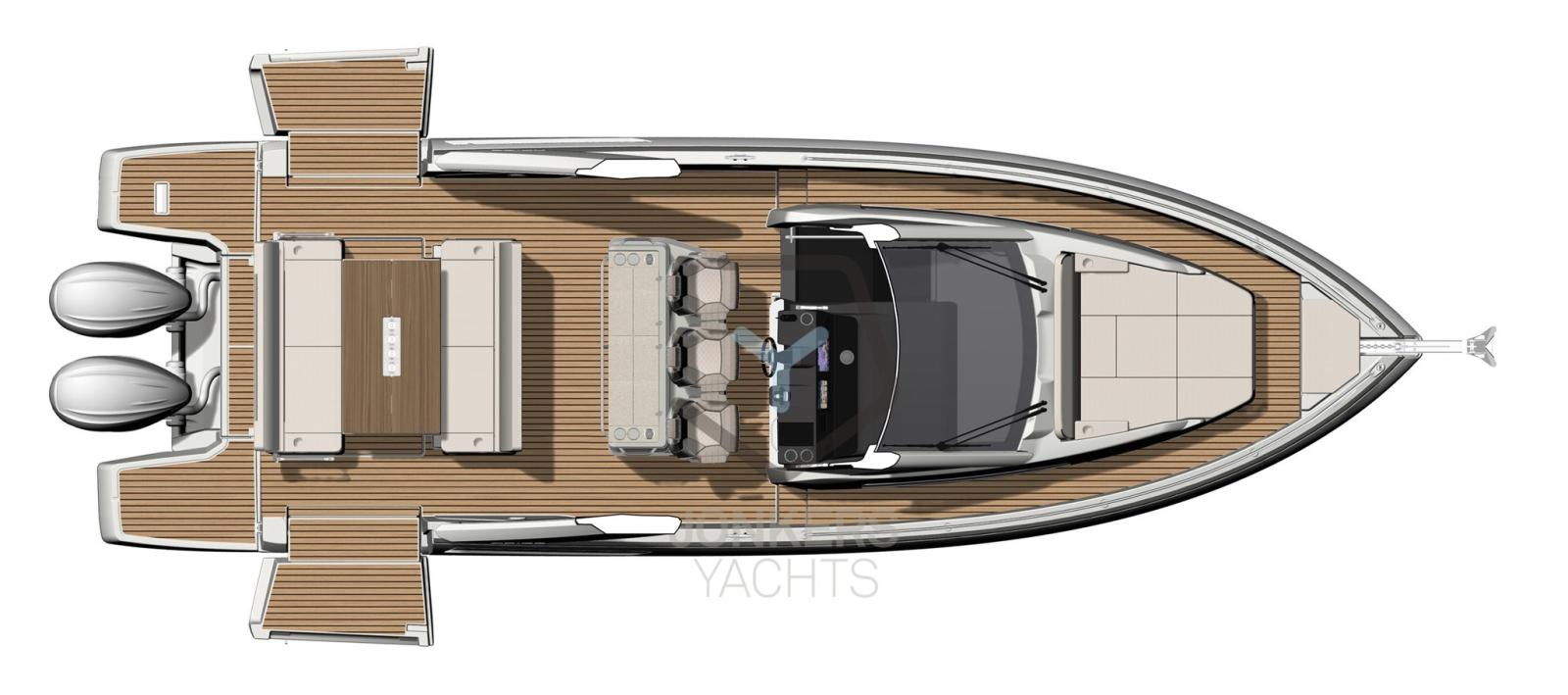La sicurezza a bordo viene prima di tutto. Con un ampio parabrezza integrato, due comodi sedili accanto al pilota, due panchine modulari, che possono essere rimosse per un collegamento aperto con il mare. Attraverso le passerelle sicure e incassate si può facilmente raggiungere il ponte di prua dove si può godere il sole.
