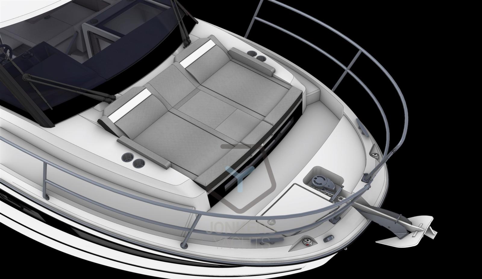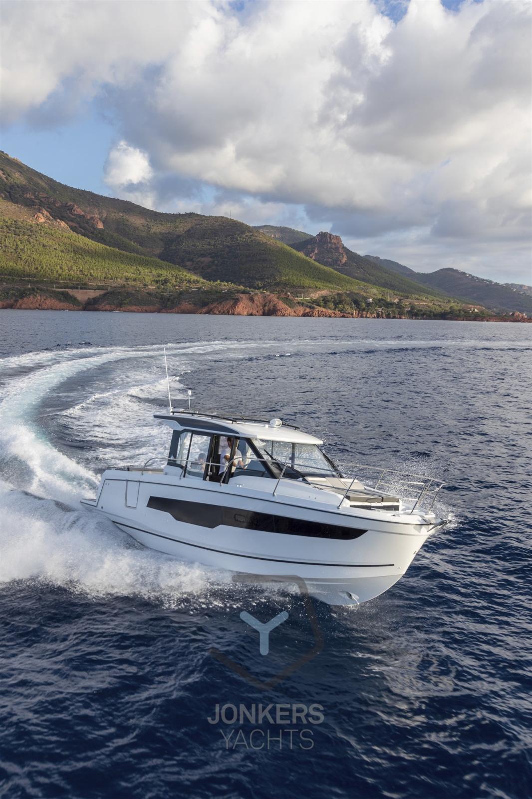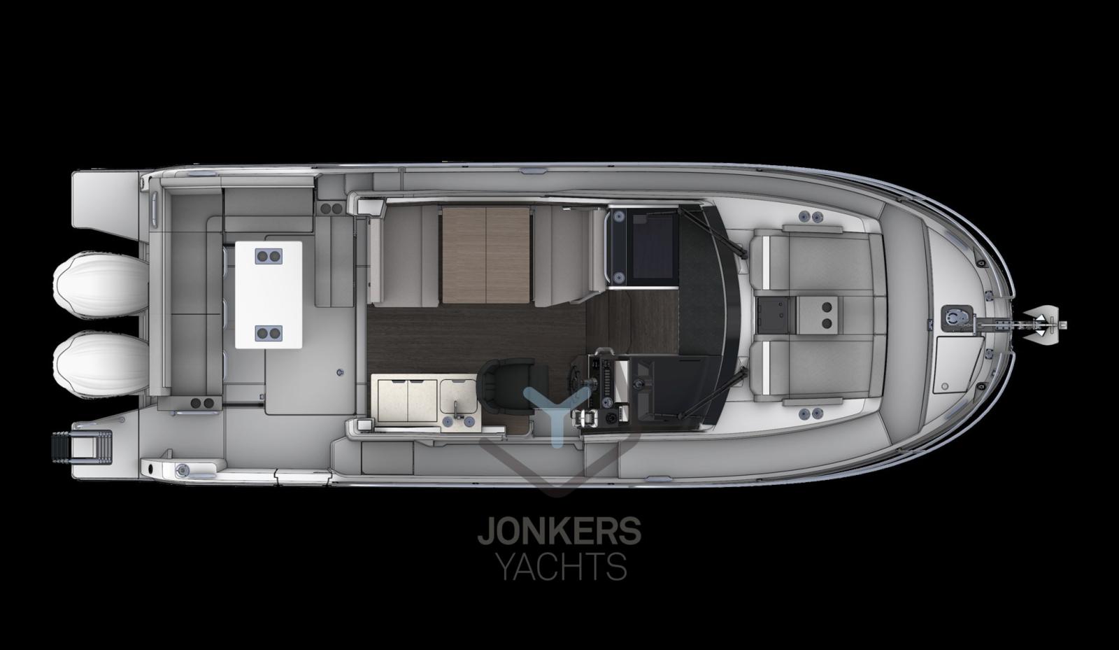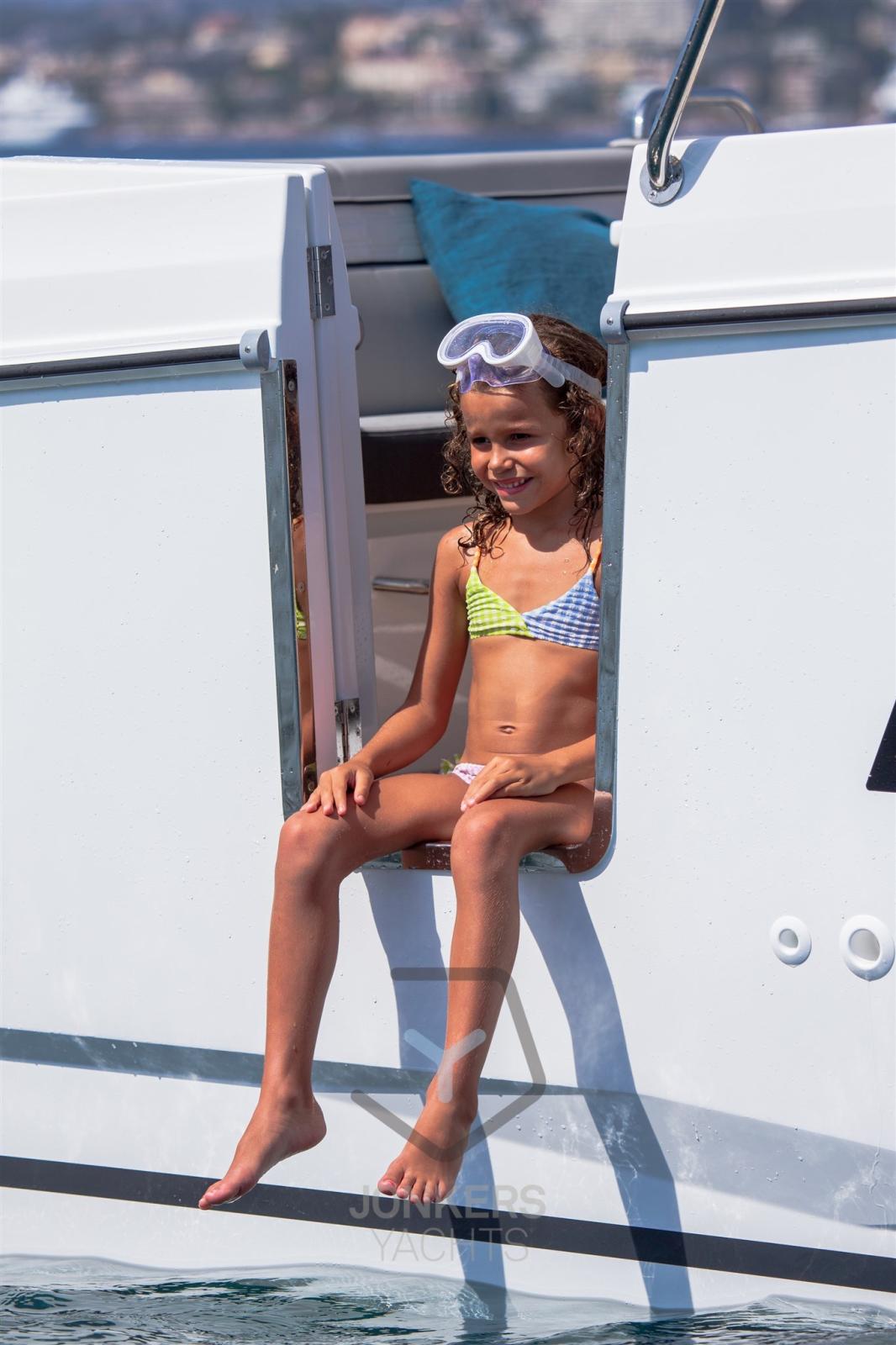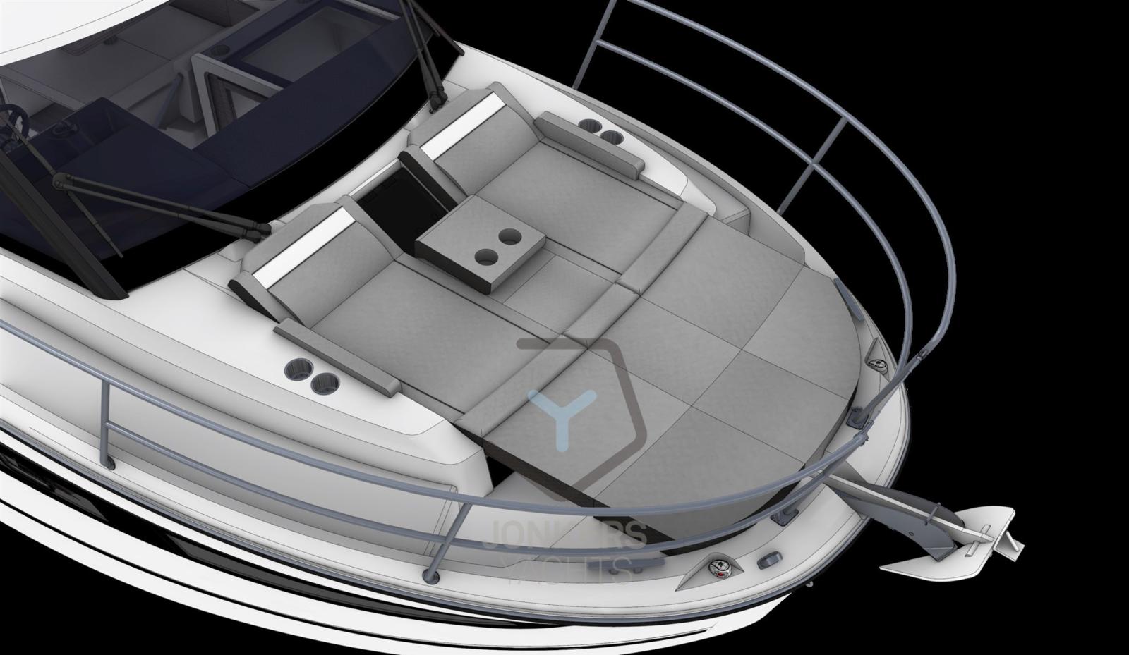 Le grandi finestre nello scafo e nel tetto della tuga si inseriscono perfettamente nella silhouette potente e sportiva. Il nuovo scafo permette di planare a partire da 20 nodi, una velocità facilmente raggiungibile con i suoi due motori, 2 x 250 CV alla massima velocità, garantendo comfort e manovrabilità.