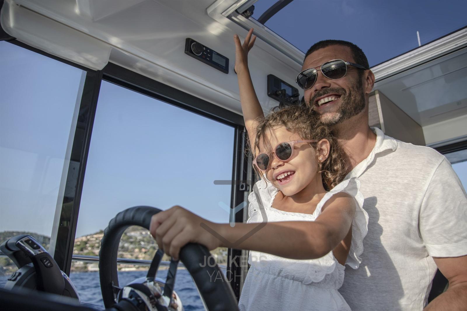Lo spazio interno offre una vista a 360 gradi sul mare. Un sacco di spazio di stivaggio e una cucina nuova, moderna e pratica contribuiscono a rendere piacevole il tempo a bordo. Quando splende il sole, la porta scorrevole in vetro può essere fatta scorrere via per portare lo spazio abitativo nel pozzetto. Con il Merry Fisher 895 Serie 2, le crociere per famiglie sono possibili in qualsiasi stagione.