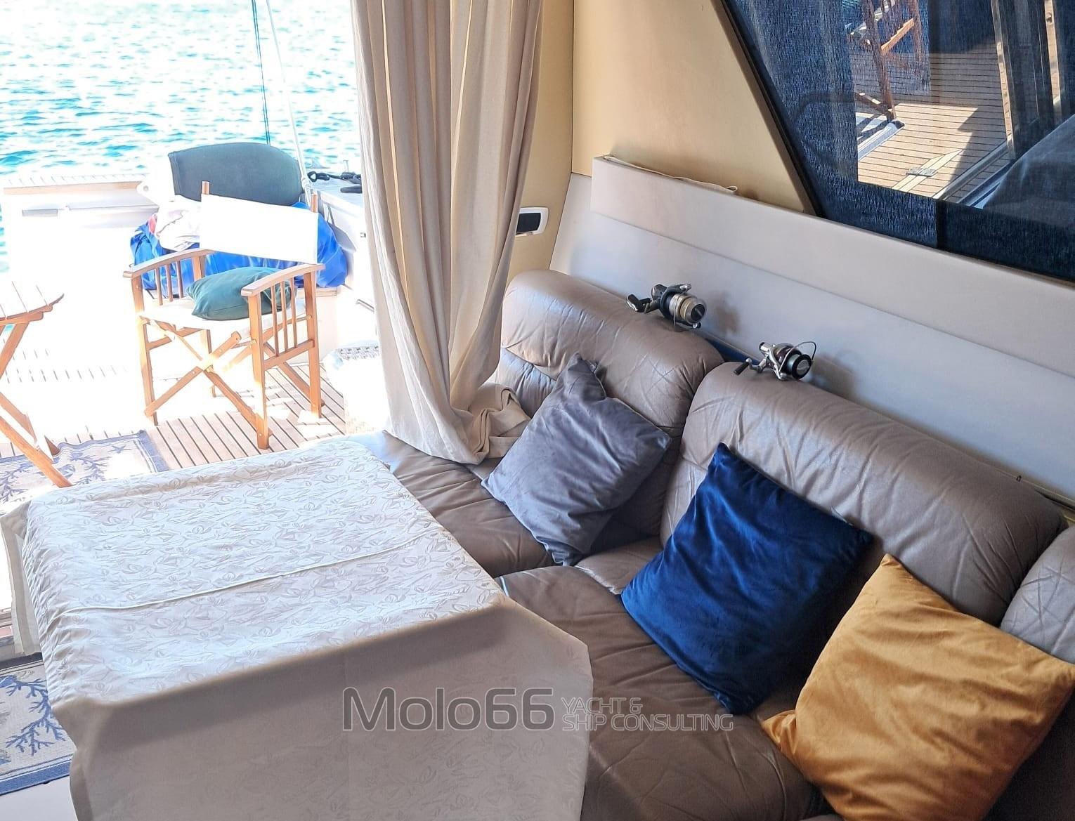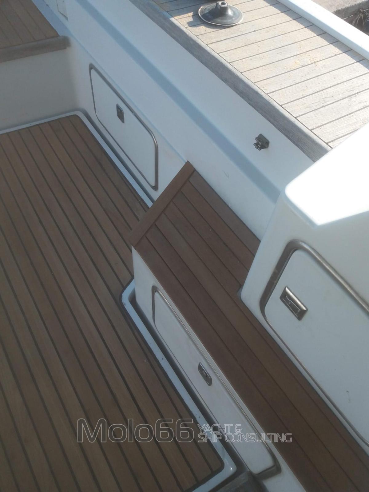 Allarme motore, Autoclave, Doccia esterna, Doppia timoneria, Flap idraulici, Impianto antincendio, Indicatori Flaps, Lavaggio catena, Luci subacquee (LED sopra linea di galleggiamento), Piattaforma, Pompa di sentina automatica, Pompa di sentina manuale, Porta ingresso, Pozzetto Teak, Presa 220V banchina, Raddrizzatore, Salpa Ancore Elettrico, Scaletta da bagno, Tromba, Winch tonneggio di prua.