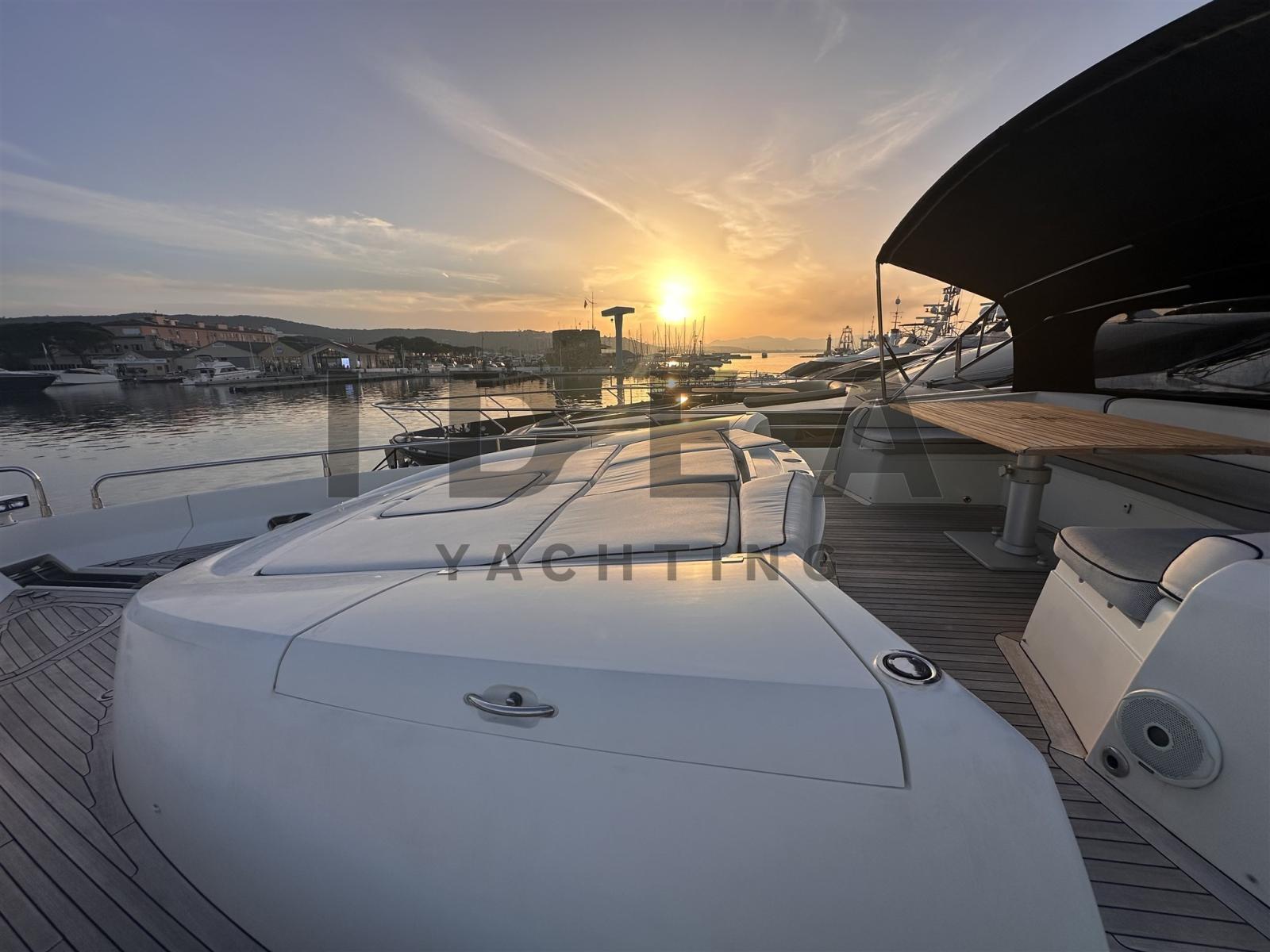 Launched in 2011, 'BST Sunrise' is a high-performance luxury yacht maintained in optimum technical condition. She offers extensive sunbathing and seating areas located at the stern, flybridge, and foredeck, which is further enhanced by a Bimini top. Additional amenities include an al fresco dining table, a barbecue grill, and a hydraulic swimming platform. The salon is light and airy, featuring comfortable seating on both the starboard and port sides, along with a coffee table, dining area, and panoramic views of the cruising destination.