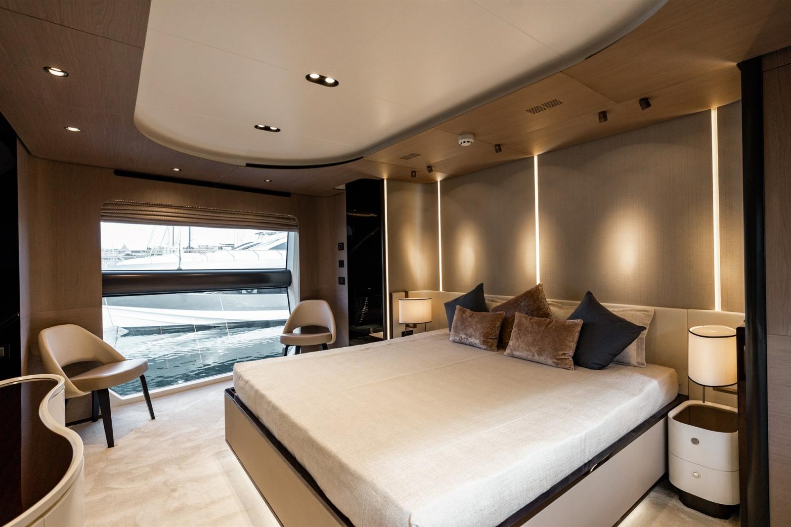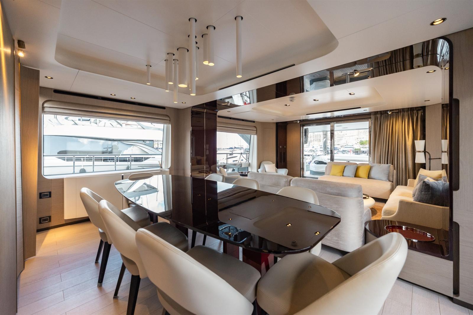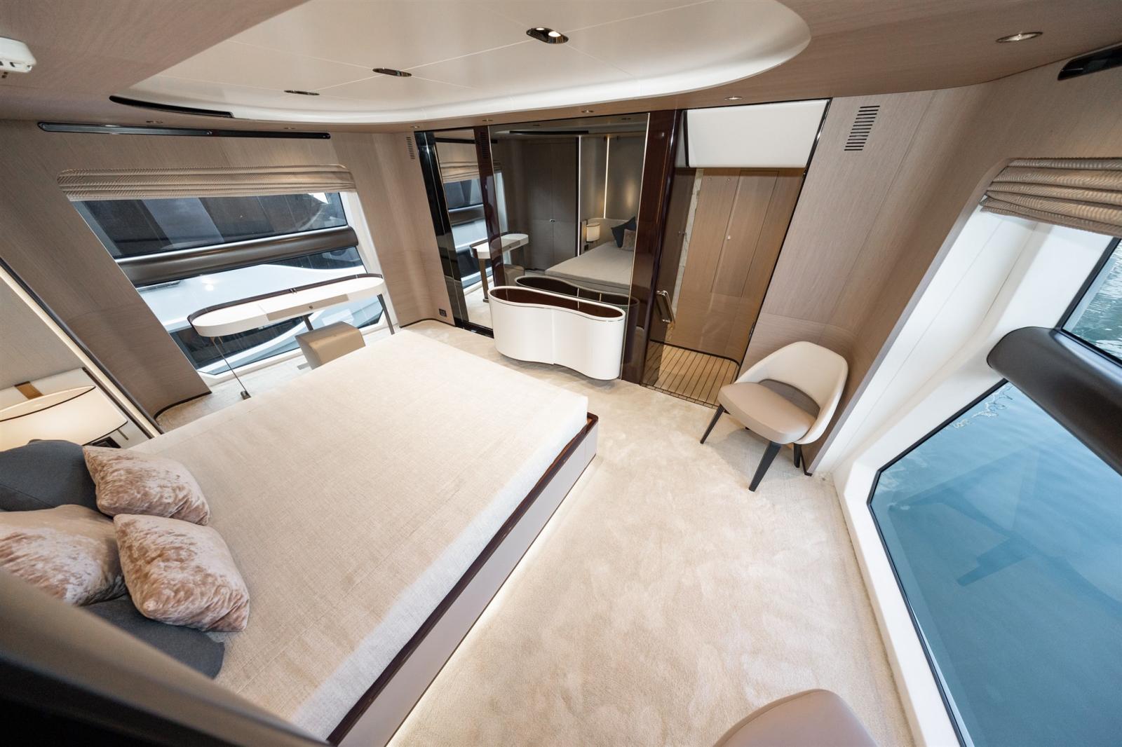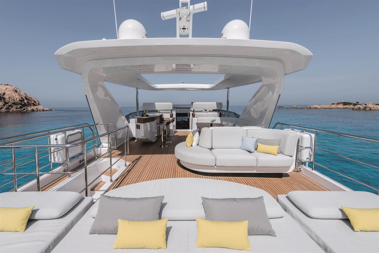 Disegnata da Stefano Righini, la Grande 27M vanta una sovrastruttura in fibra di carbonio, che garantisce una guida leggera ma ultra stabile. L'ampio flybridge, il beach club e il salone di prua offrono l'ambiente perfetto per il relax e l'intrattenimento, mentre la generosa suite armatoriale a tutto baglio sul ponte principale offre un rifugio privato con finiture opulente.