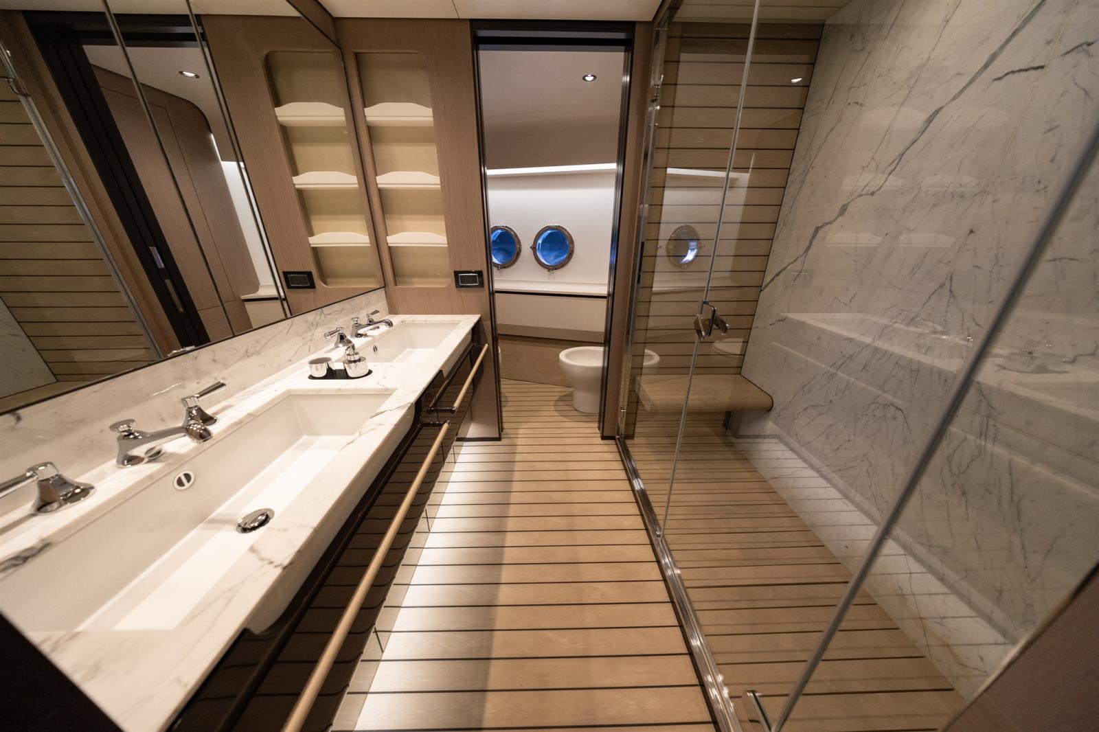 Allarme fumo/gas, Allarme motore, Allarme sentina, Autoclave, Auto-Trim, Camminamenti laterali in teak, Colorazione speciale, Doccia esterna, Fari fissi a poppa, Faro orientabile, Garage per tender, Gruette per tender, Hard top, Impianto antincendio, Indicatori Flaps, Lavaggio catena, Lavandino nel Pozzetto, Luci di cortesia, Luci subacquee, Passerella, Piattaforma, Pompa di sentina automatica, Pozzetto Teak, Presa 220V banchina, Scala reale, Scaletta da bagno, Stabilizzatori, Tavolo pozzetto, Tromba, Tuga in teak, Winch tonneggio di poppa, Winch tonneggio di prua.