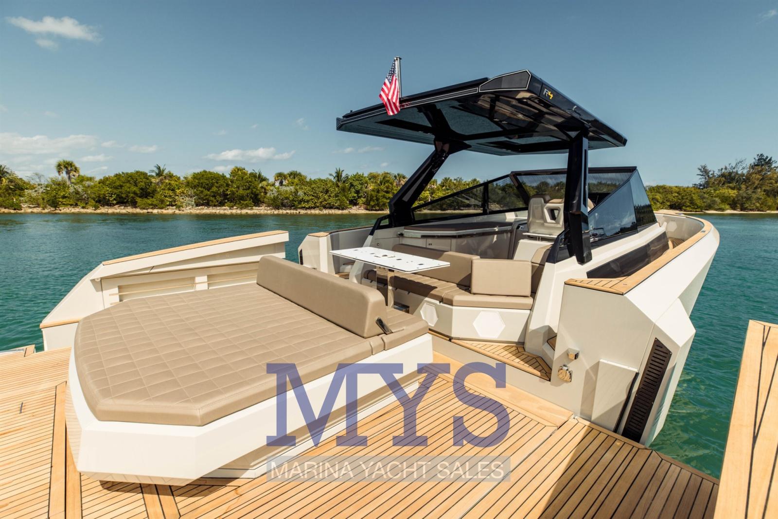 Il design di R4 Walkaround è fortemente influenzato dal mondo delle auto sportive, con alcuni elementi distintivi che caratterizzano la silhouette decisa, come il T-Top in acciaio e le prese d’aria in carbonio sui lati dello scafo.
