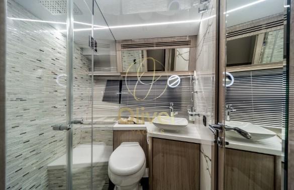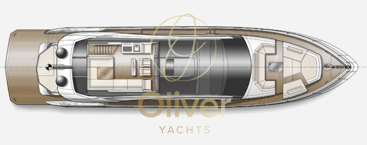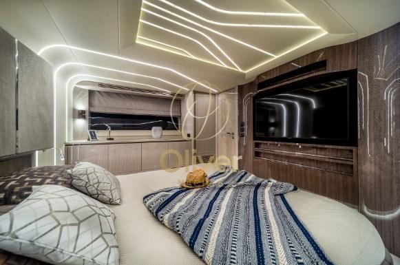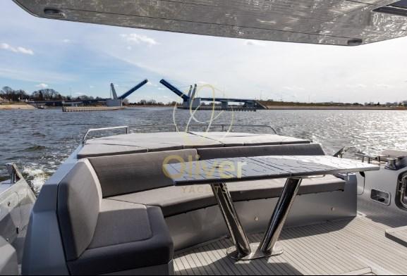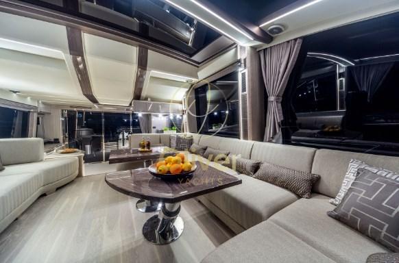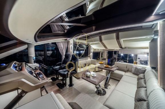 I passeggeri apprezzeranno sicuramente gli ampi passavanti laterali che consentono un accesso sicuro all'area ricreativa di prua che si aprirà scorrendo con il semplice tocco di un pulsante. Notare il tetto apribile in vetro sopra la postazione di comando e i grandi pannelli di vetro sia a babordo che a tribordo che si ritireranno rapidamente, aprendo l'intero salone. Il ponte superiore è dotato di sedili sportivi gemelli, mobile bar e un'ampia area salotto.