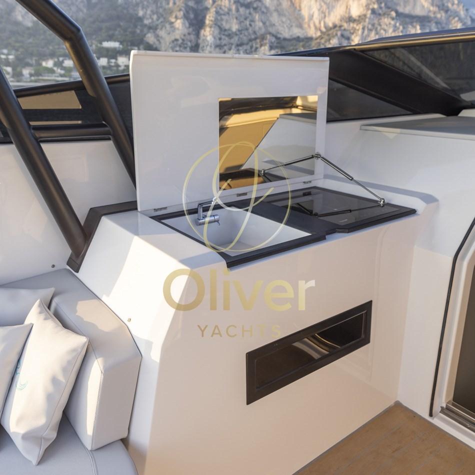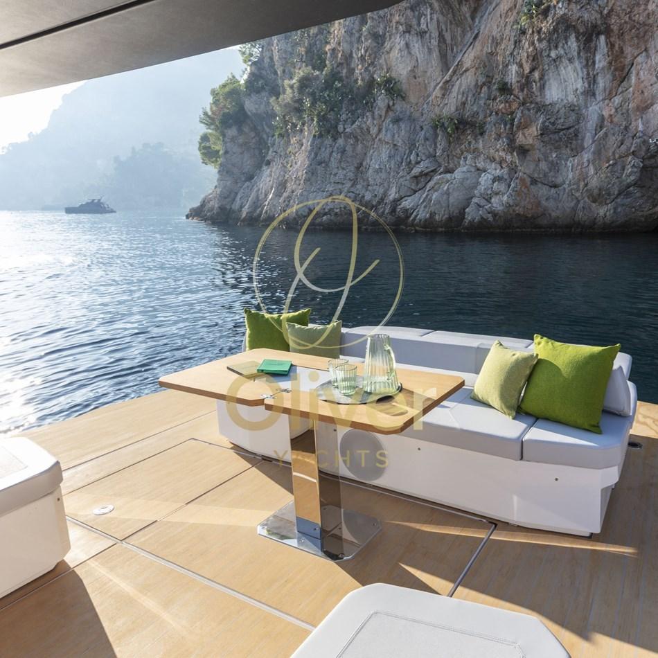 Il pozzetto ha un ampio prendisole, un garage per tender e sedute movibili che permettono di modificare il layout del pozzetto in pochi minuti. Le due terrazze che si aprono ai lati permettono di abbattere i confini visivi, sentirsi immersi nella natura e rendere il mare parte dell’arredo.