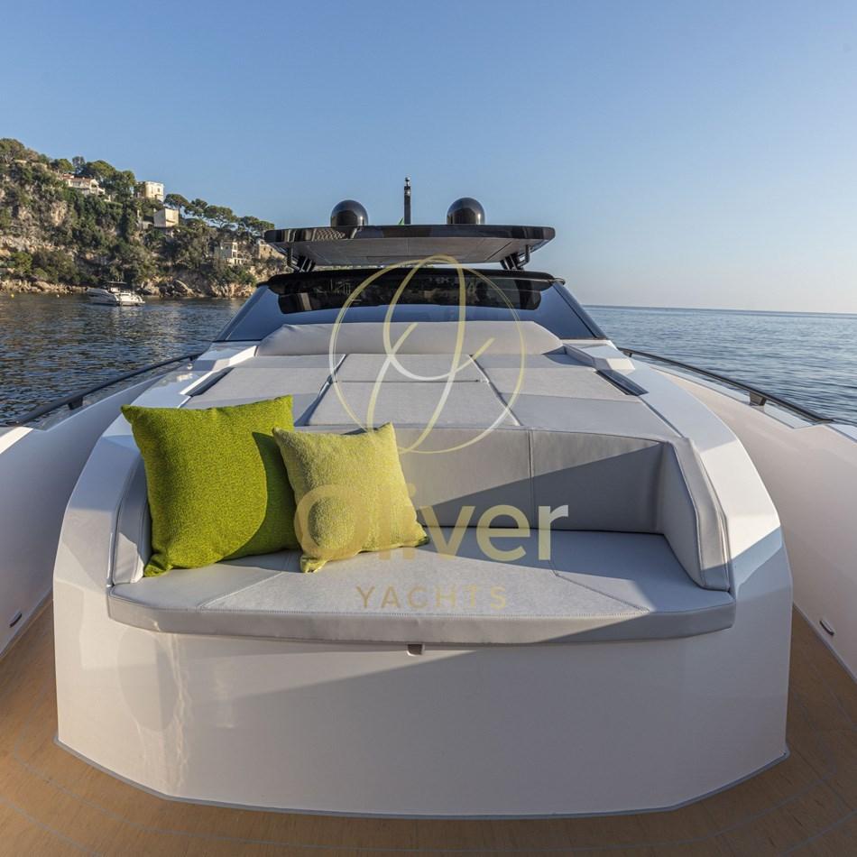 La postazione di guida, tecnologica e moderna, è protetta da un ampio e saldo Bimini. Il passaggio a prua è ampio, comodo e sicuro: in pochi passi si arriva al doppio divano contrapposto a prua del prendisole sulla tuga.