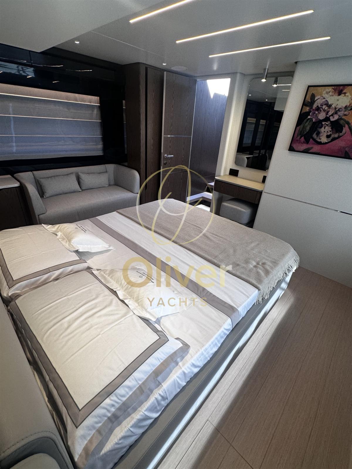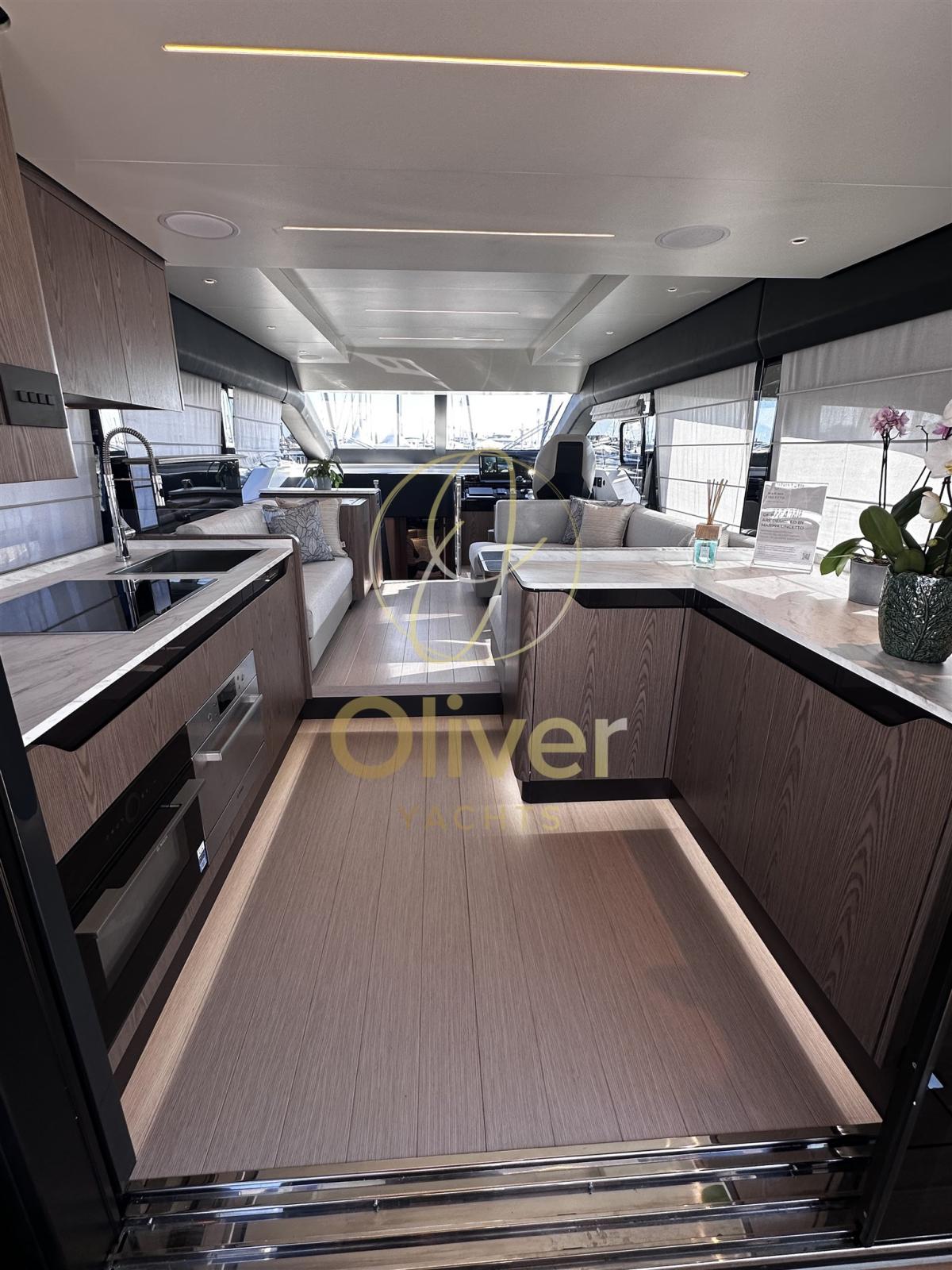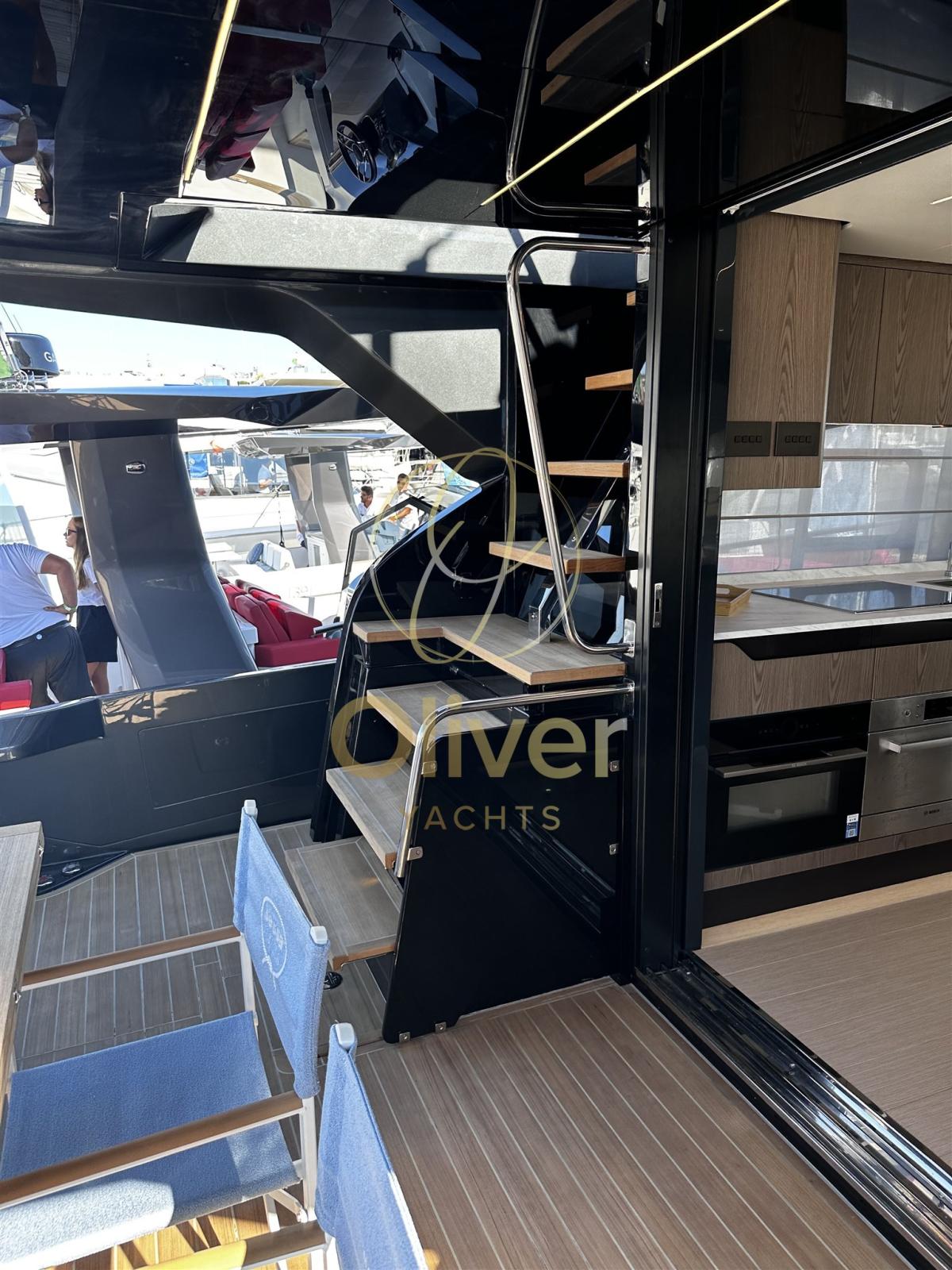 Allarme motore, Apertura Vano Motore Elettrica, Auto Dynamic Trim Interceptor, Autoclave, Camminamenti laterali in teak, Colorazione speciale, Doccia esterna, Flap elettrici, Garage per tender, Impianto antincendio, Indicatori Flaps, Luci di cortesia, Luci subacquee, Passerella, Piattaforma, Pozzetto Teak, Presa 220V banchina, Salpa Ancore Elettrico, Scaletta da bagno, Tavolo pozzetto, Tromba.