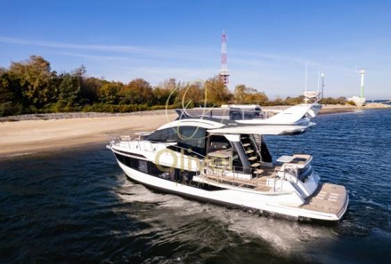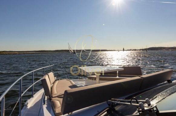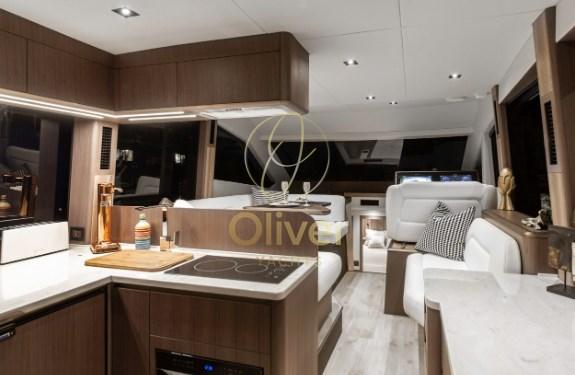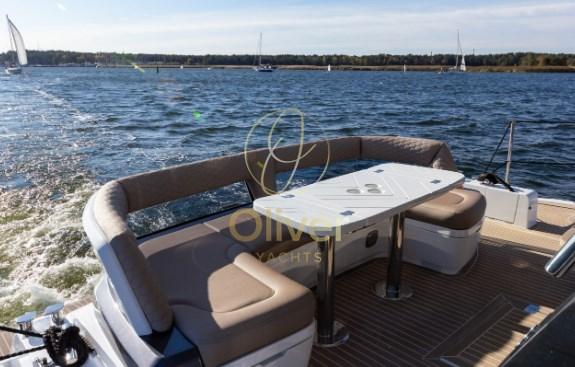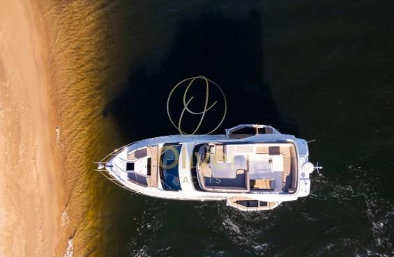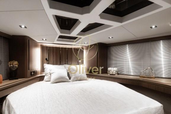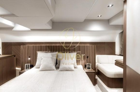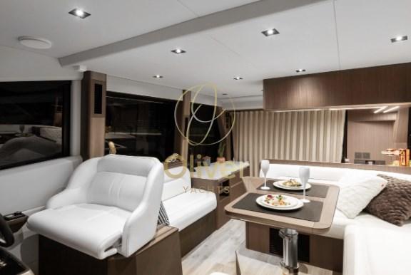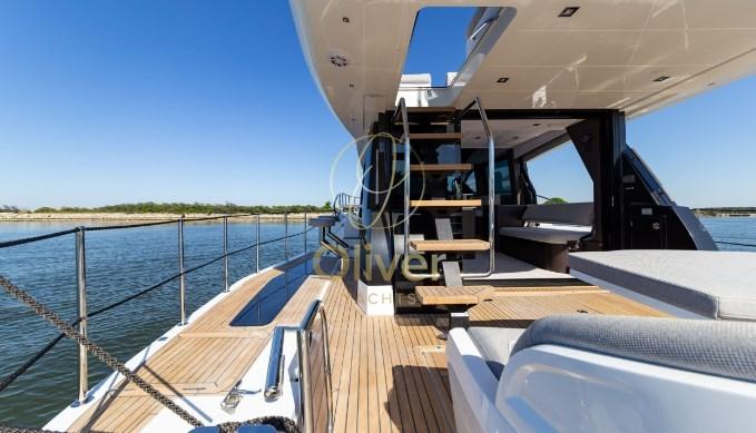 Il flybridge è dotato di due distinte aree salotto, un mobile bar e una postazione di pilotaggio superiore completamente attrezzata. Con l'uso della tecnologia del carbonio, il risparmio di peso ha consentito di avere più spazio nella parte superiore e una migliore maneggevolezza grazie al baricentro più basso. L'amata modalità Beach fa un ritorno trionfante, affascinante con balconi parzialmente vetrati, espandendo di fatto lo spazio utilizzabile nel pozzetto quando si decide di gettare l'ancora. I posti a sedere di poppa saranno caratterizzati da un'opzione griglia a scomparsa accessibile dalla piattaforma idraulica.