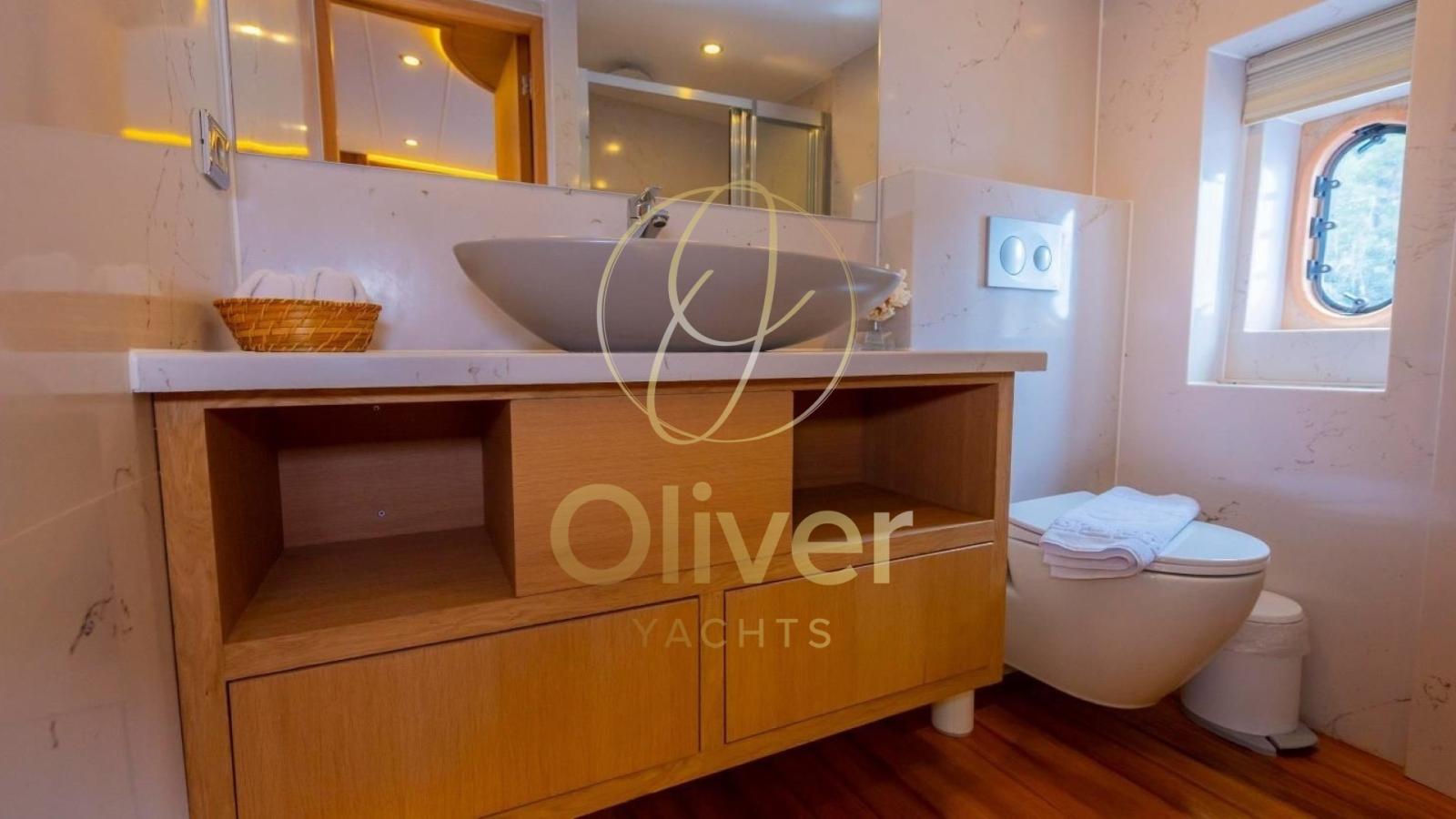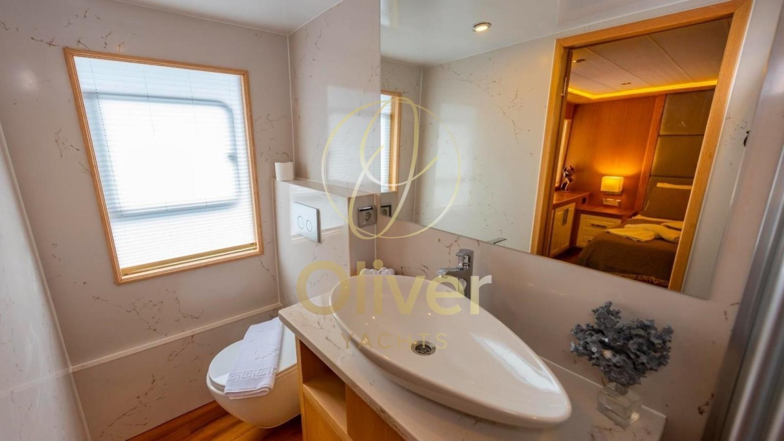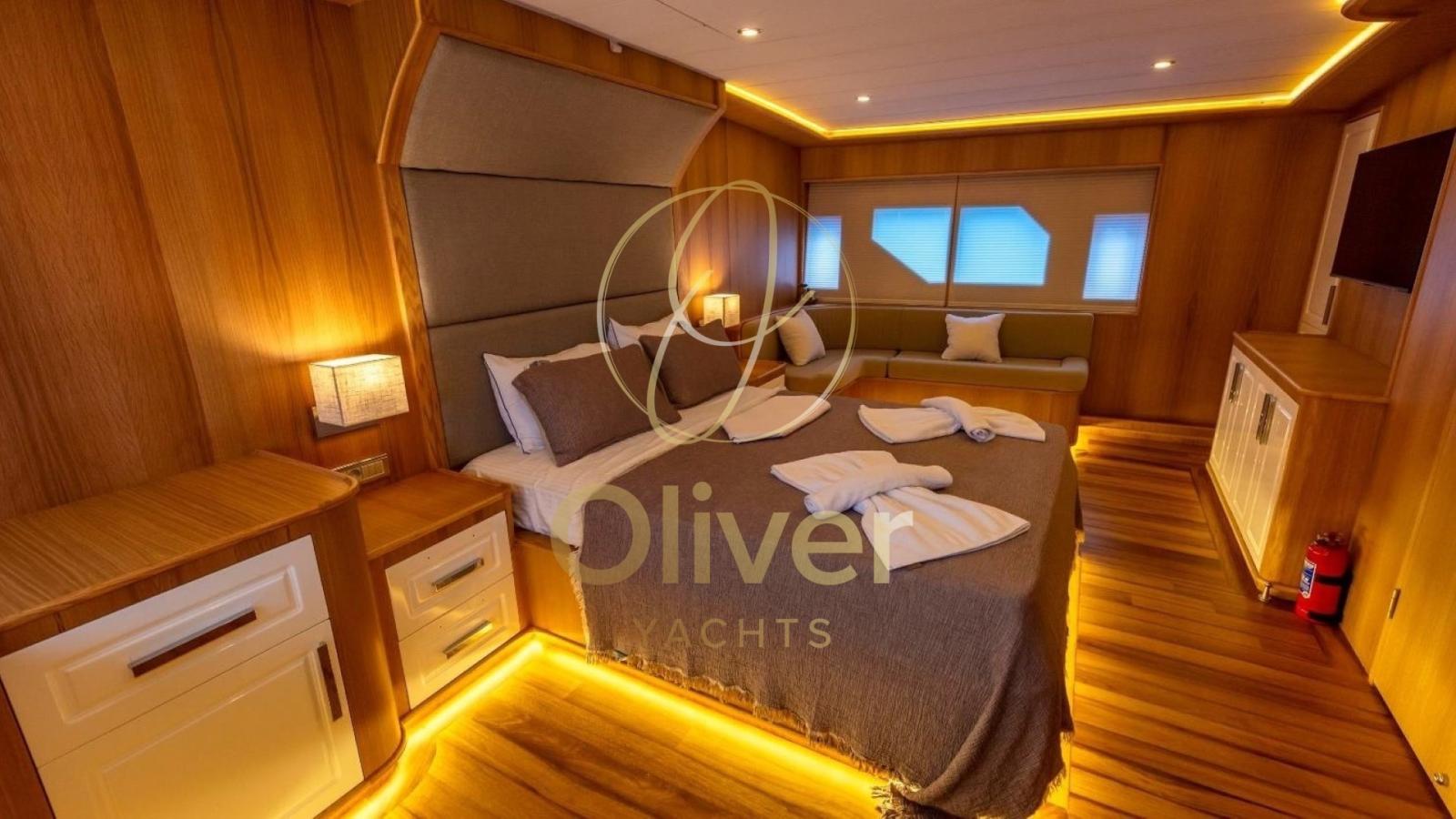 Le cinque cabine lussuose, tra cui 3 master e 2 doppie, sono ampie e dotate di grandi finestre panoramiche che riempiono gli spazi di luce naturale, regalando una vista mozzafiato sul mare. Ogni cabina è arricchita da un sistema di illuminazione soffusa a LED, creando un’atmosfera intima e rilassante. Gli arredi includono letti spaziosi, testate imbottite e divani integrati, perfetti per momenti di relax. I bagni privati, dal design contemporaneo, sono rifiniti con superfici in marmo e includono comodi box doccia, lavabi eleganti e dettagli di alta qualità.