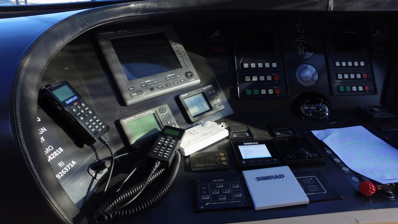 AIS (FURUNO), Angolo barra, 2 Bussola, 4 Comando motori elettronico (et cadran moteur de 2024), Contamiglia (B&G Hydra 2000), 2 DSC vhf (Simrad HS100), GPS (FURUNO GP 37), Pilota automatico (FURUNO avec rep fly), Plotter con antenna GPS (MAX SEA ecran 17 avec répétiteur fly et clavier), Radar (FURUNO FRS1000), Radio VHF (Icom BC210), Sonar (B&G Hydra 2000), Stazione vento (B&G Hydra 2000).