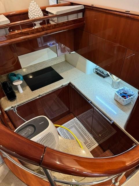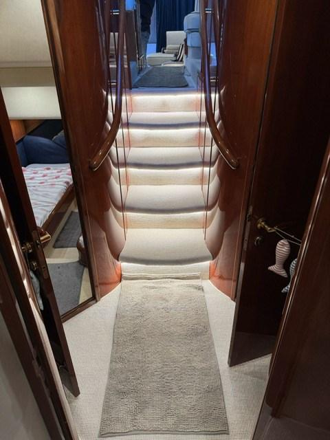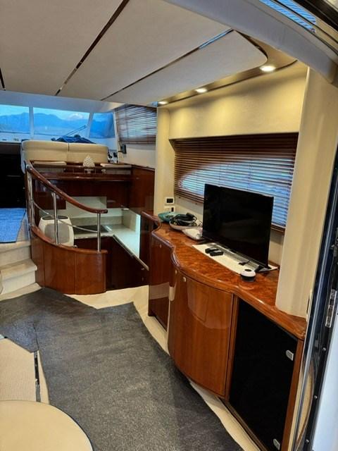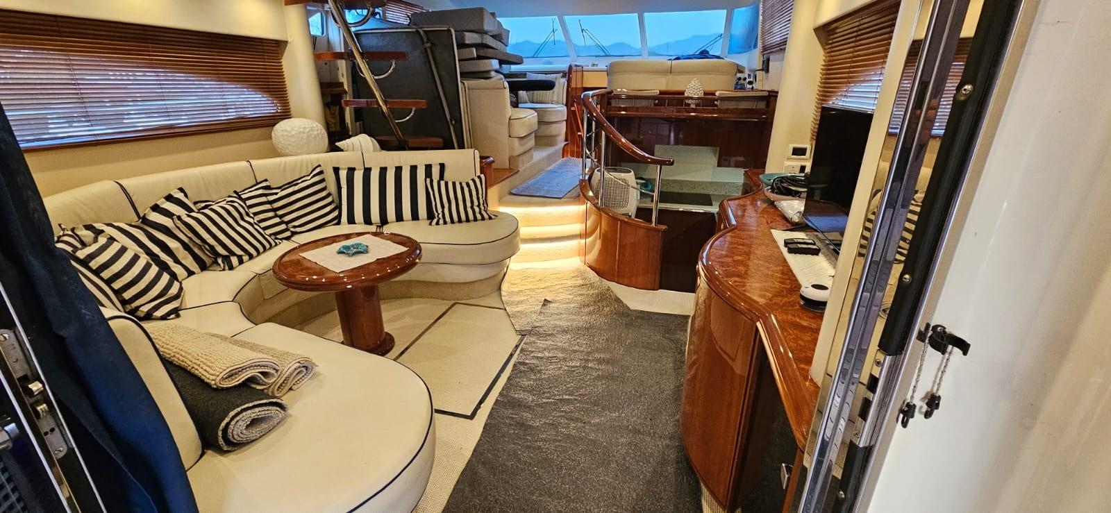 - Salone con divano a "C" e tavolo, mobile contenitore contrapposto, scala interna per salire la fly, dinette lato SX con divano semicircolare e tavolo rotondo, timoneria contrapposta con due poltrone e scala discesa al ponte cabine