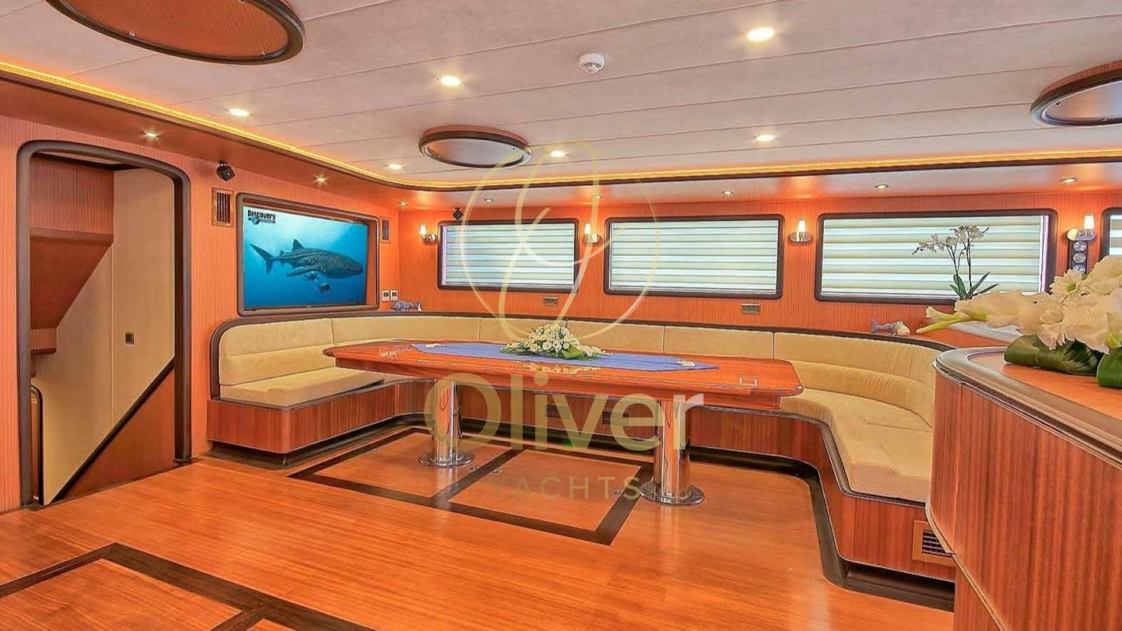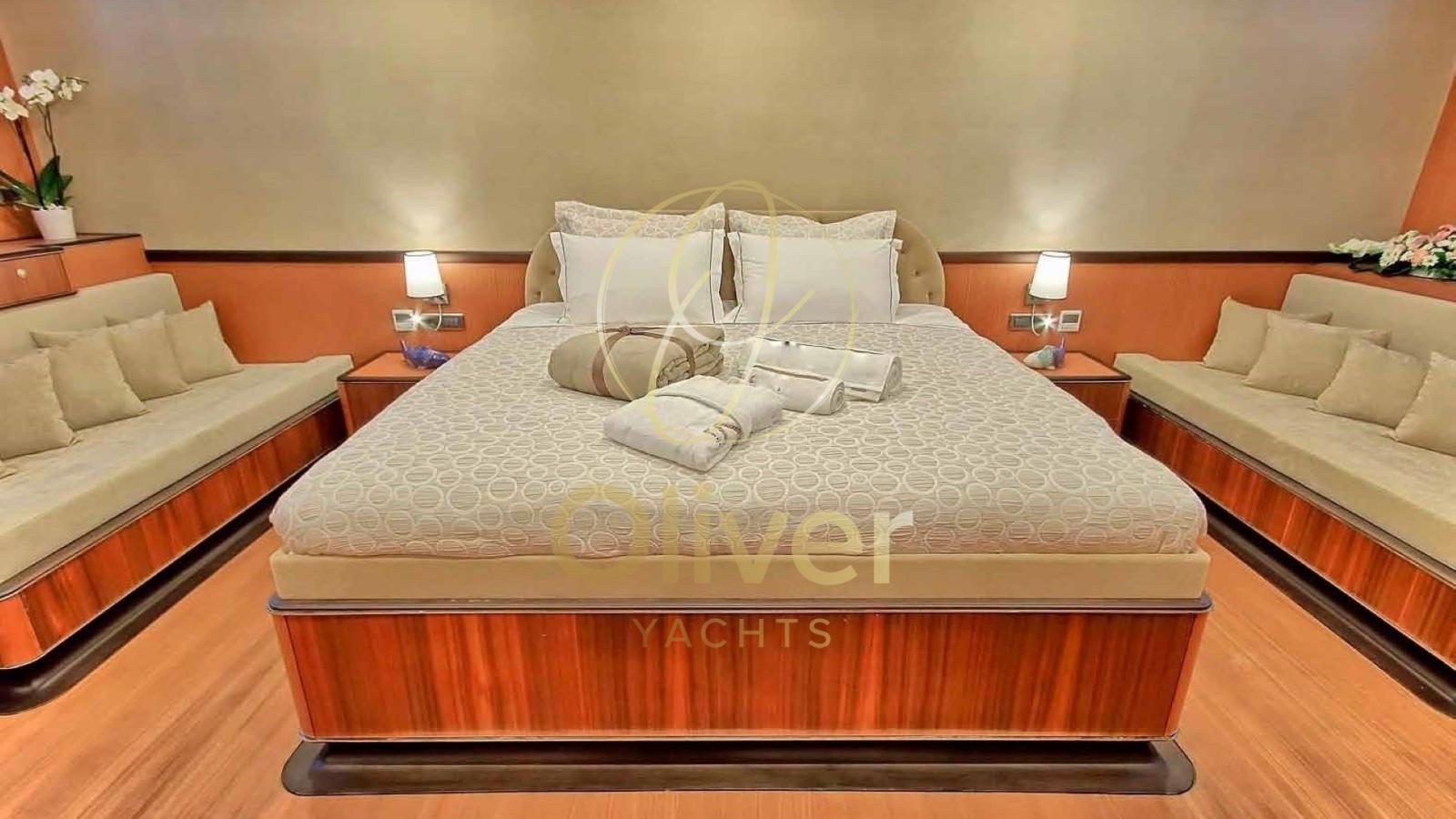 Gli interni sono progettati con finiture di alta qualità, utilizzando legno pregiato e dettagli sofisticati. La goletta dispone di otto cabine lussuose, tra cui una Master, una VIP quattro Doppie e due triple, tutte con bagno privato e aria condizionata.