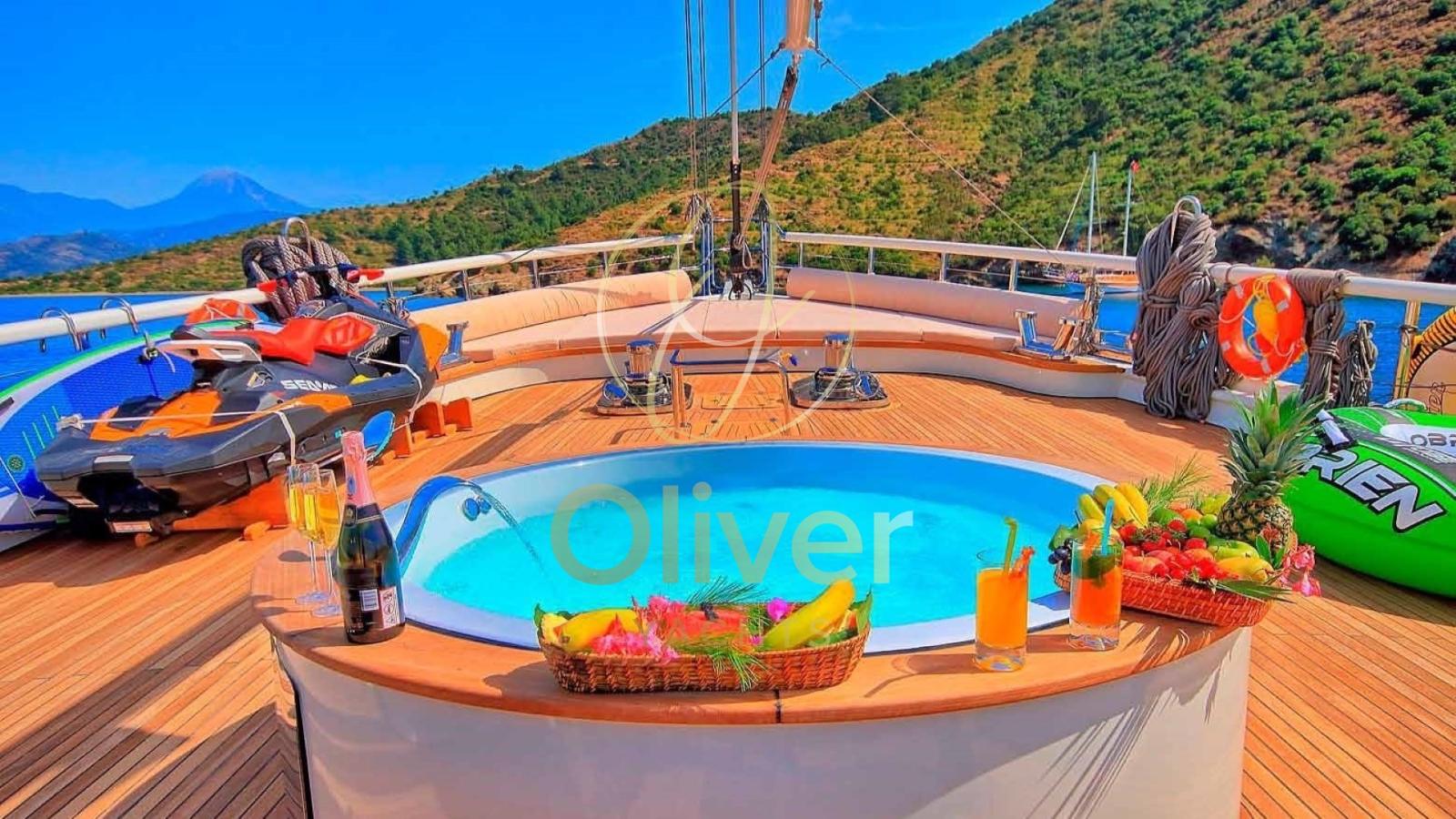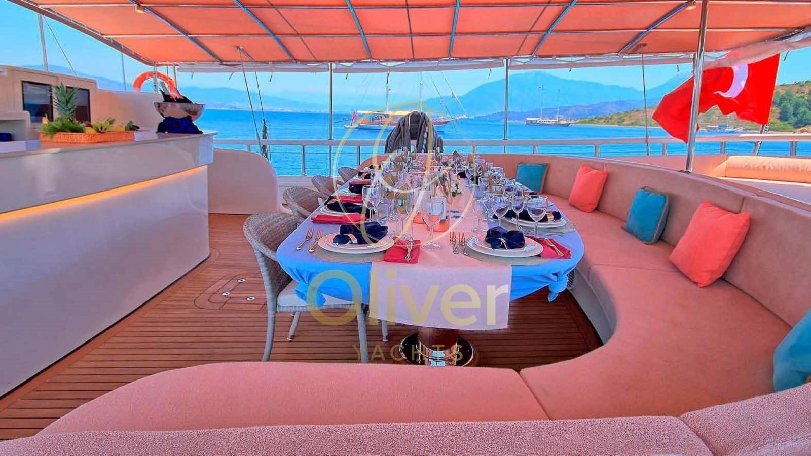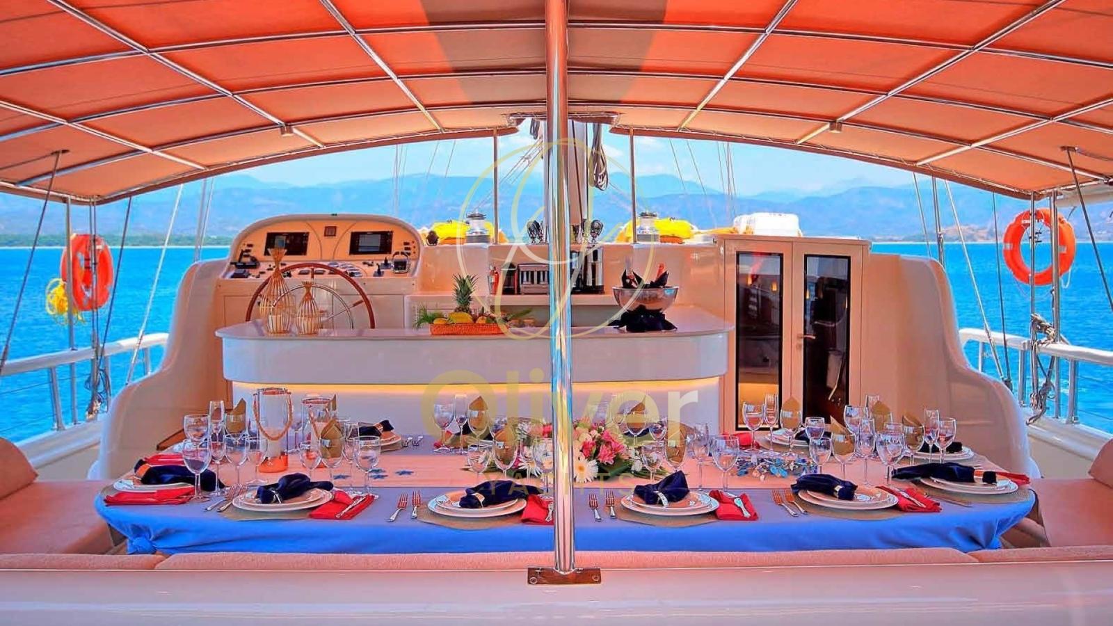 Con una larghezza di 8,5 metri, offre spazi generosi sia all’interno che all’esterno. Il ponte a prua, con una grande area prendisole e una jacuzzi, è perfetto per rilassarsi mentre si gode la vista sul mare. A poppa, una spaziosa zona pranzo all’aperto permette di cenare in totale comfort, circondati dall’atmosfera unica della vita in mare.