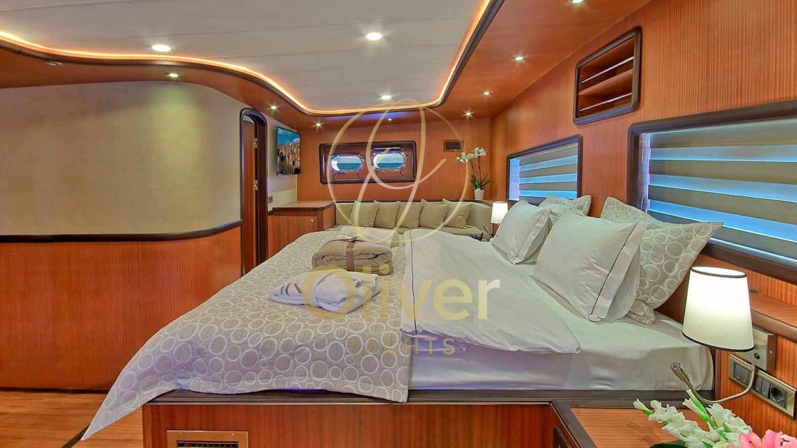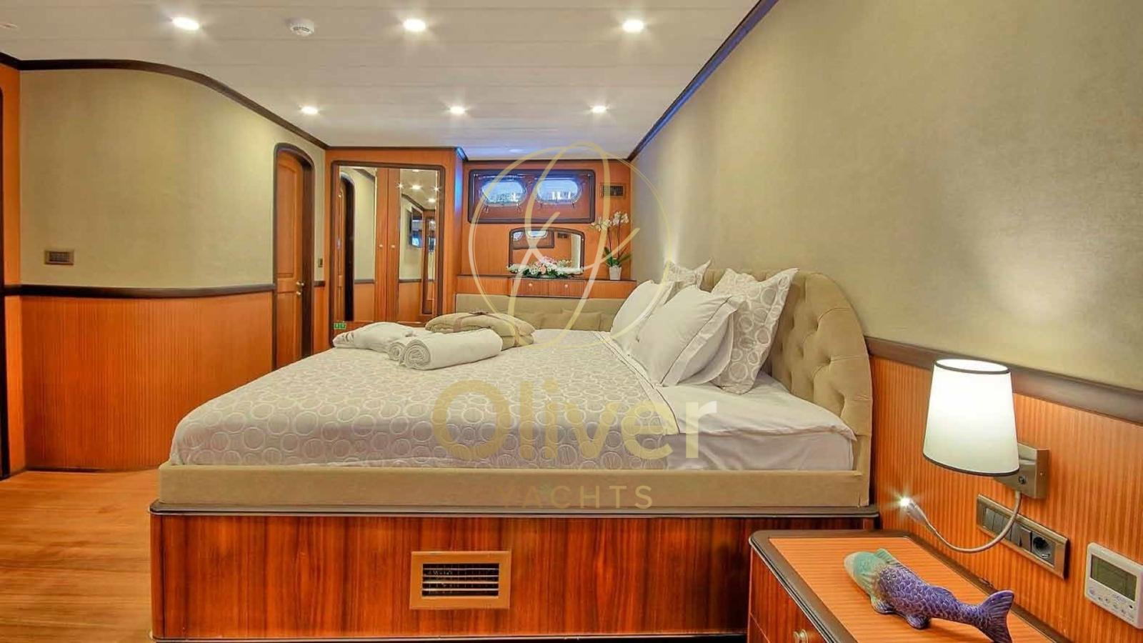 La goletta può ospitare fino a 18 persone in otto cabine spaziose, ognuna dotata di bagno privato, aria condizionata e un design curato nei minimi dettagli. Le due cabine Master offrono spazi più ampi, con letti king-size e un arredamento raffinato. Le quattro cabine doppie e le due triple garantiscono il massimo comfort, con ampie zone di stivaggio e illuminazione regolabile.