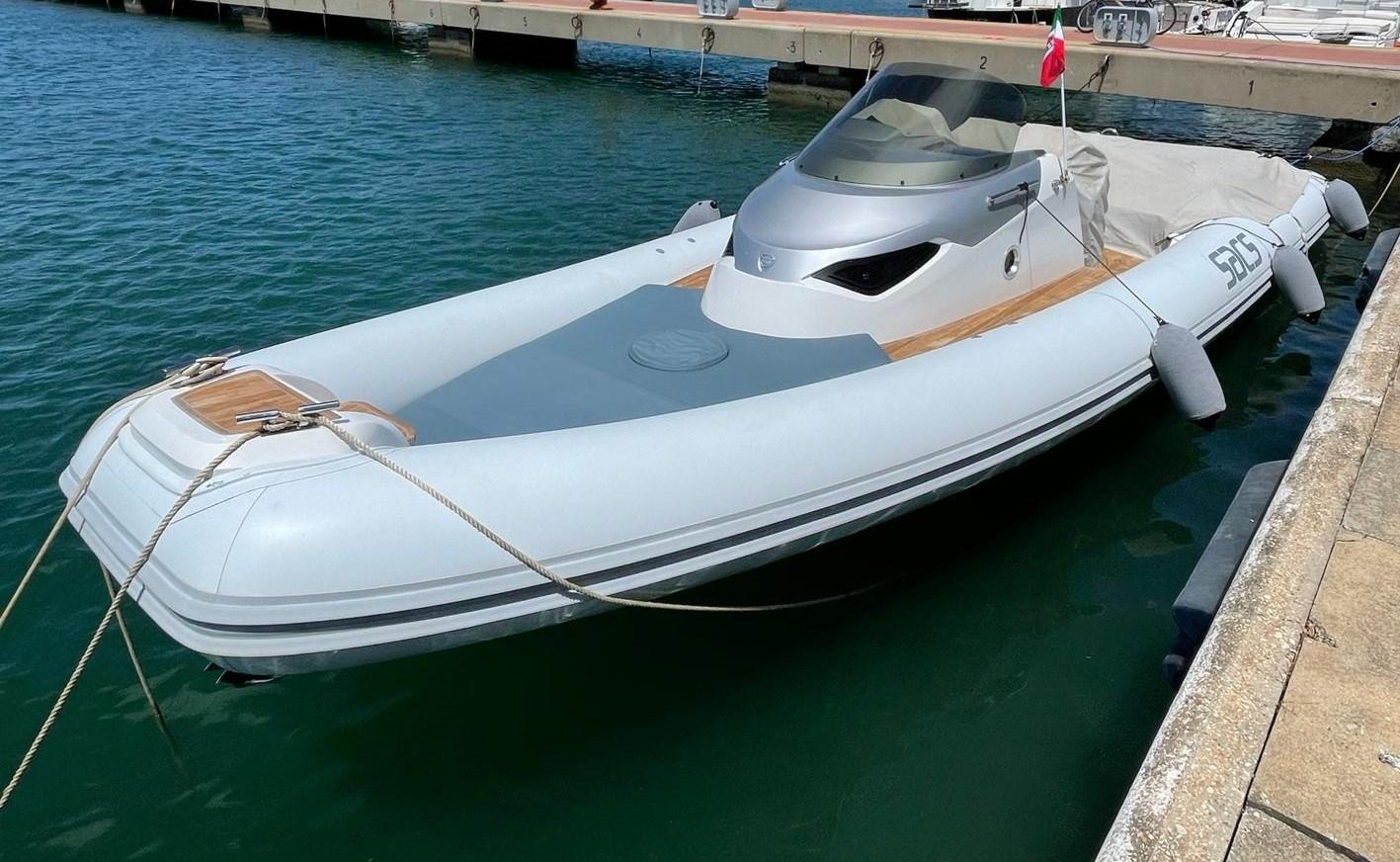 Scafo e coperta in gelcoat bianco, consolle, musone bar top ed eventuale Sport Top verniciati Silver F426. Tubolare ice white con bottazzo grigio, logo SACS grigio Nettuno, cuscinerie esterne in Silvertex Sandstone , tendalino grigio. Interni in essenza di Rovere “brezzato” con top e giroletto bianchi. Coperta in massello di teak filettato grigio.