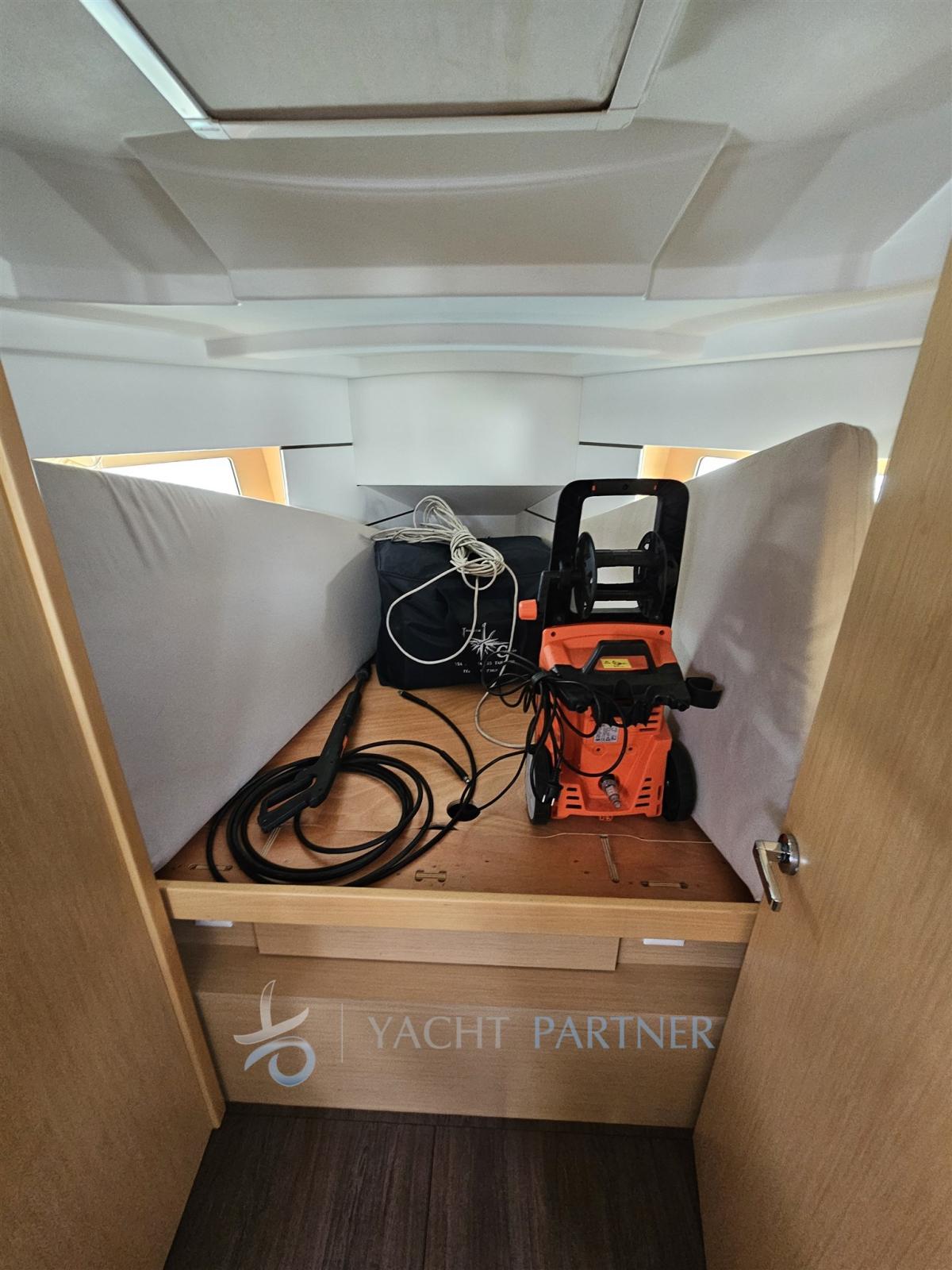 Allarme motore, Autoclave, 4 Batterie (sostituite 2022), Doccia esterna (con miscelatore), Passerella (in carbonio), Piattaforma (abbattibile), Pompa di sentina manuale, Pozzetto Teak, Presa 220V banchina, Rollbar, Salpa Ancore Elettrico, Sartiame spiroidale, Scaletta da bagno, Supporto motore fuoribordo, Tavolo pozzetto, 4 Winch, Windex.