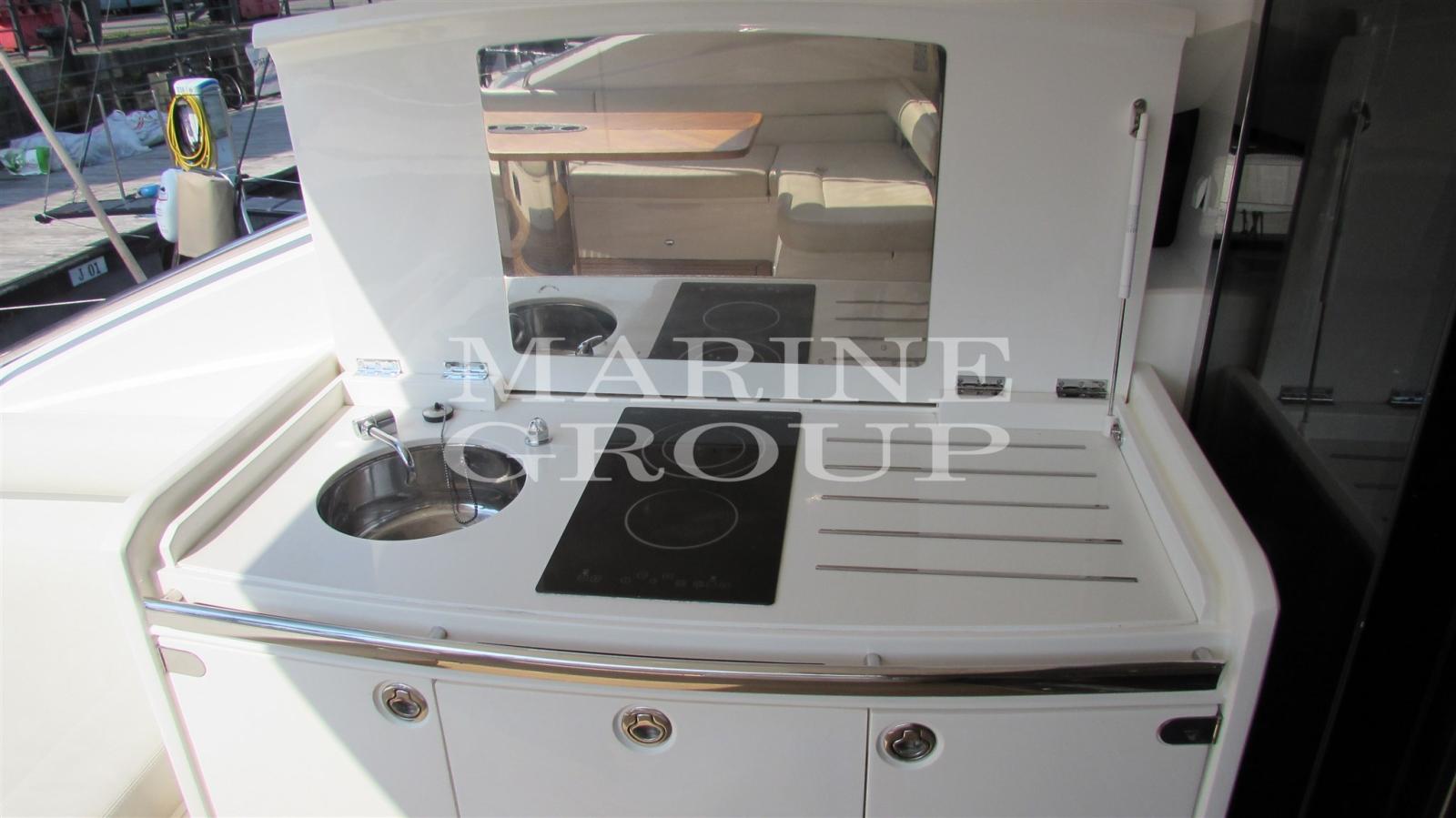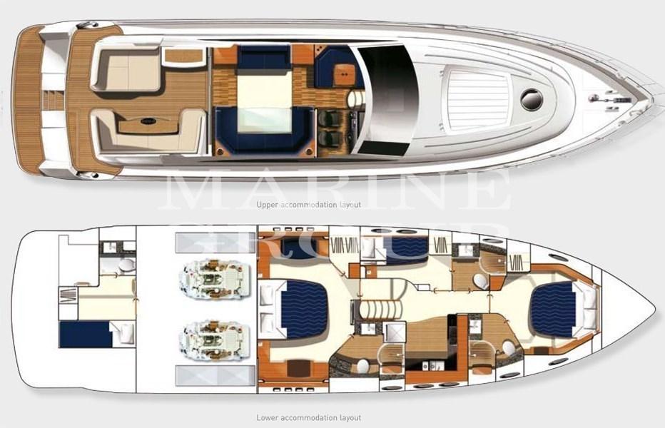 Ampio pozzetto con prendisole e tavolo con sedute e porte scorrevoli - Salone interno con tv a scomparsa - Cucina attrezzata - Cabina armatoriale a centro barca con bagno ensuite - Cabina Vip a prua con letto matrimoniale e bagno ensuite - Cabina ospiti con letti a castello e bagno ensuite - Cabina equipaggio con bagno a poppa