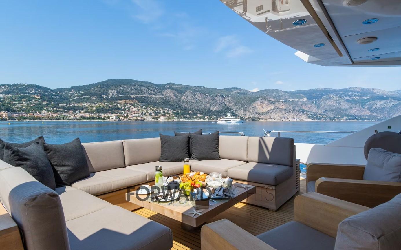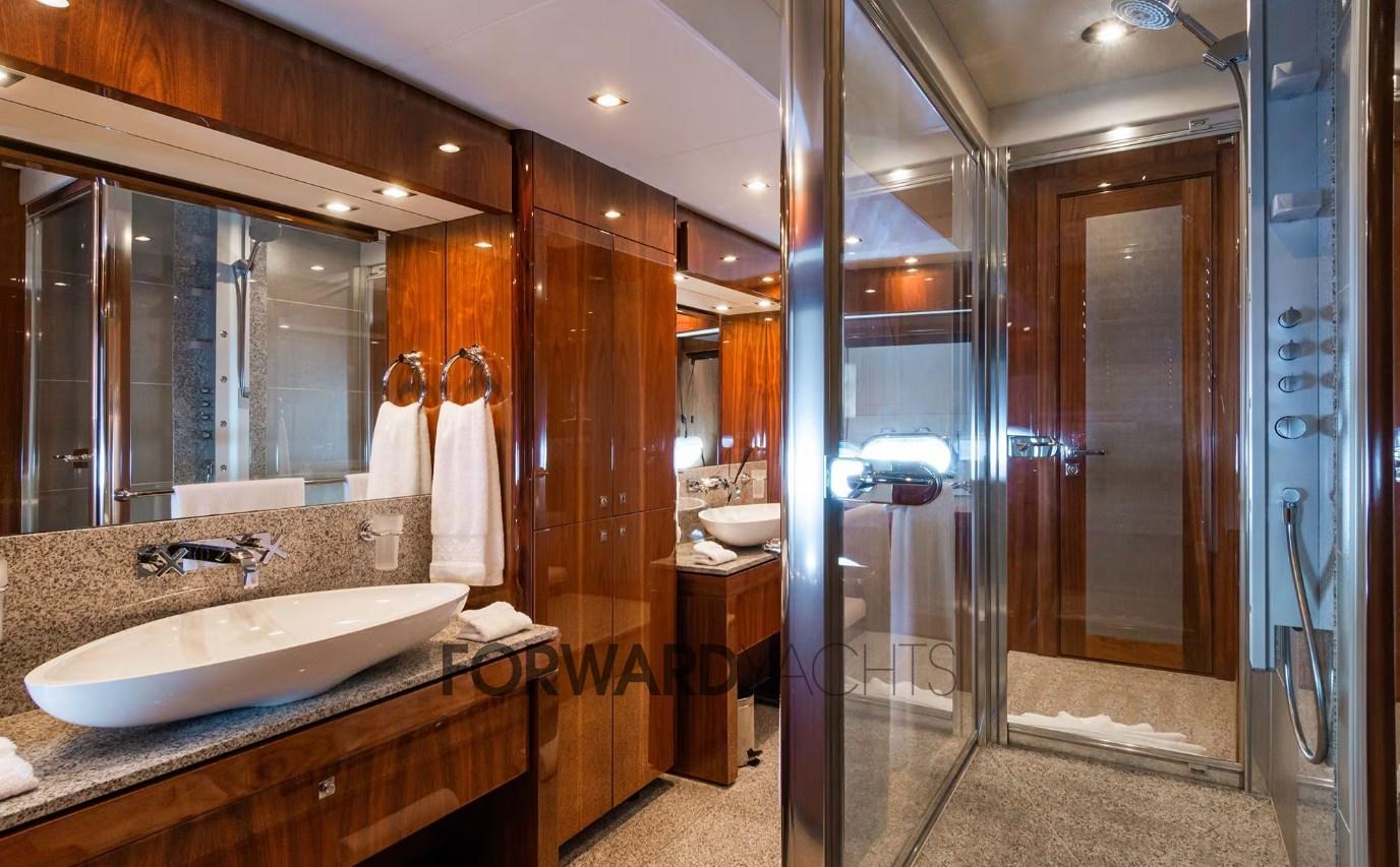 L'imbarcazione è equipaggiata con 2 motori MTU da 2.600Hp e dotata di molti accessori, tra i quali: stabilizzatori a pinne, 2 x generatore Kohler, jacuzzi sul fly bridge, garage per tender, piattaforma idraulica up & down e una vasta gamma di giochi d'acqua.