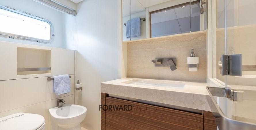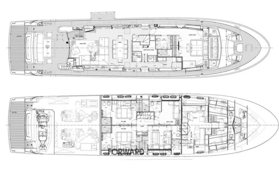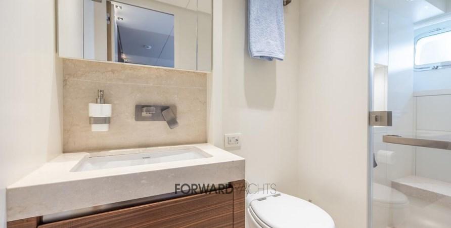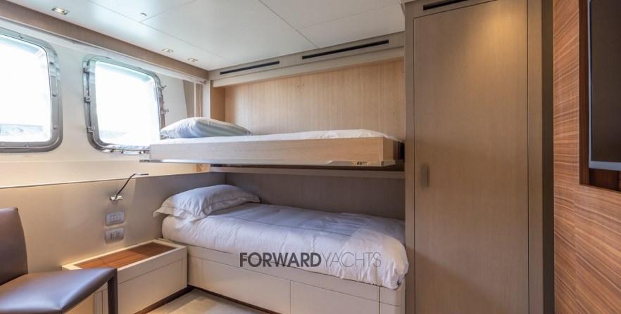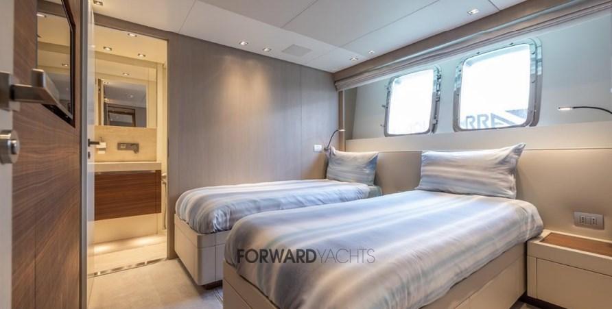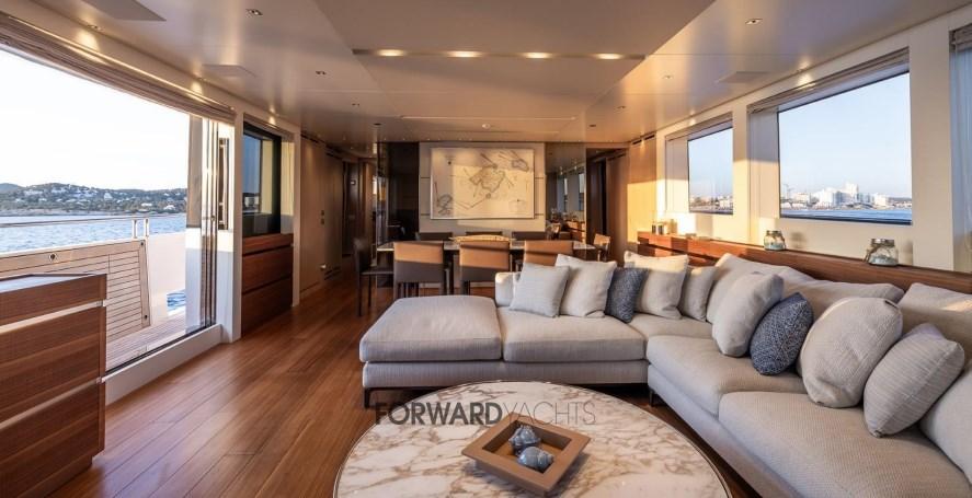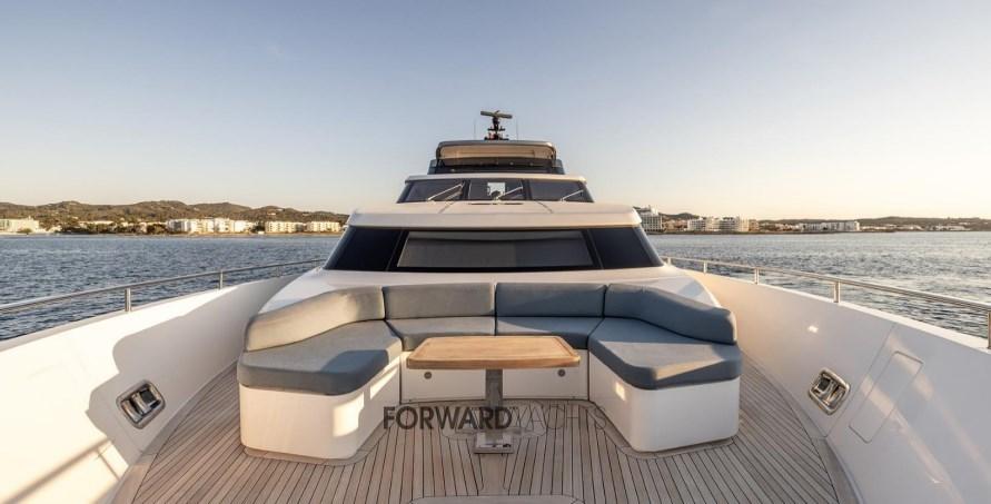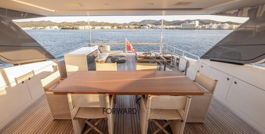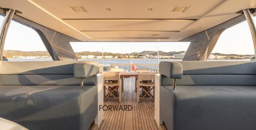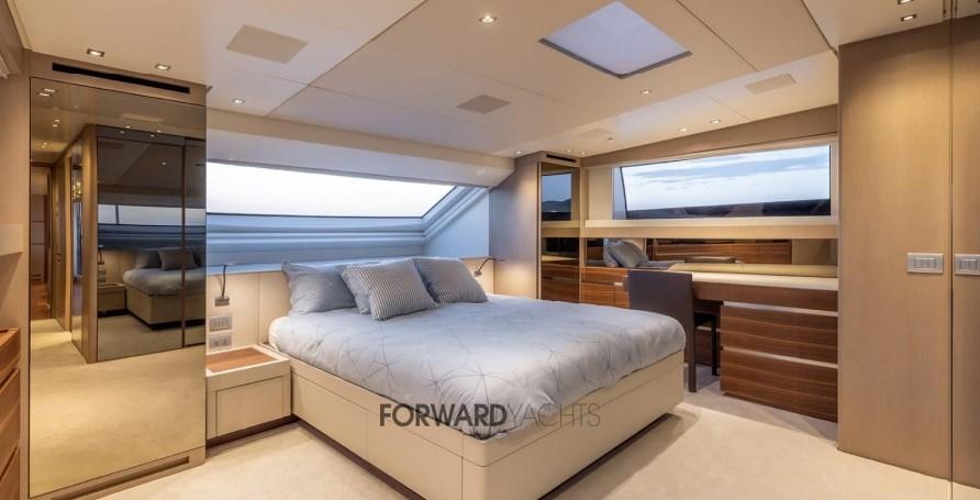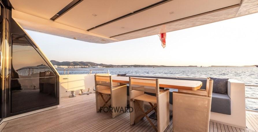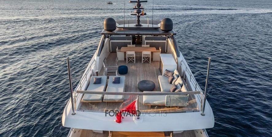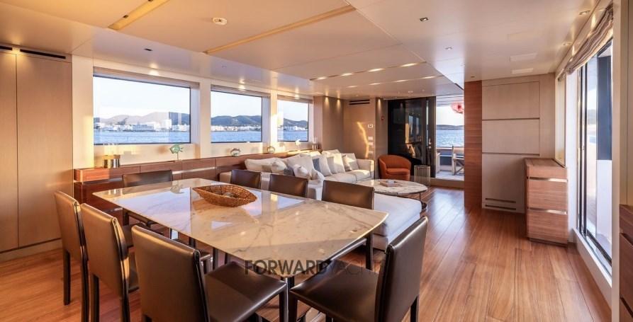 Caratterizzata da ampli spazi interni ed esterni eleganti e confortevoli, l'imbarcazione offre 5 spaziose cabine con suite armatoriale sul ponte principale. Equipaggiata poi con 2 motori MTU con poche ore di moto e dotata di molti accessori extra integrati alla sua già ampia dotazione di attrezzature, inclusi stabilizzatori zero-speed, piattaforma idraulica, terrazza richiudibile dal salone principale ed aria condizionata tropicale.