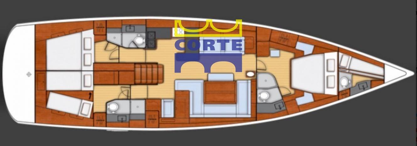 Versione 3 cabine + 3 bagni con box doccia separati + cabina marinaio con bagno.