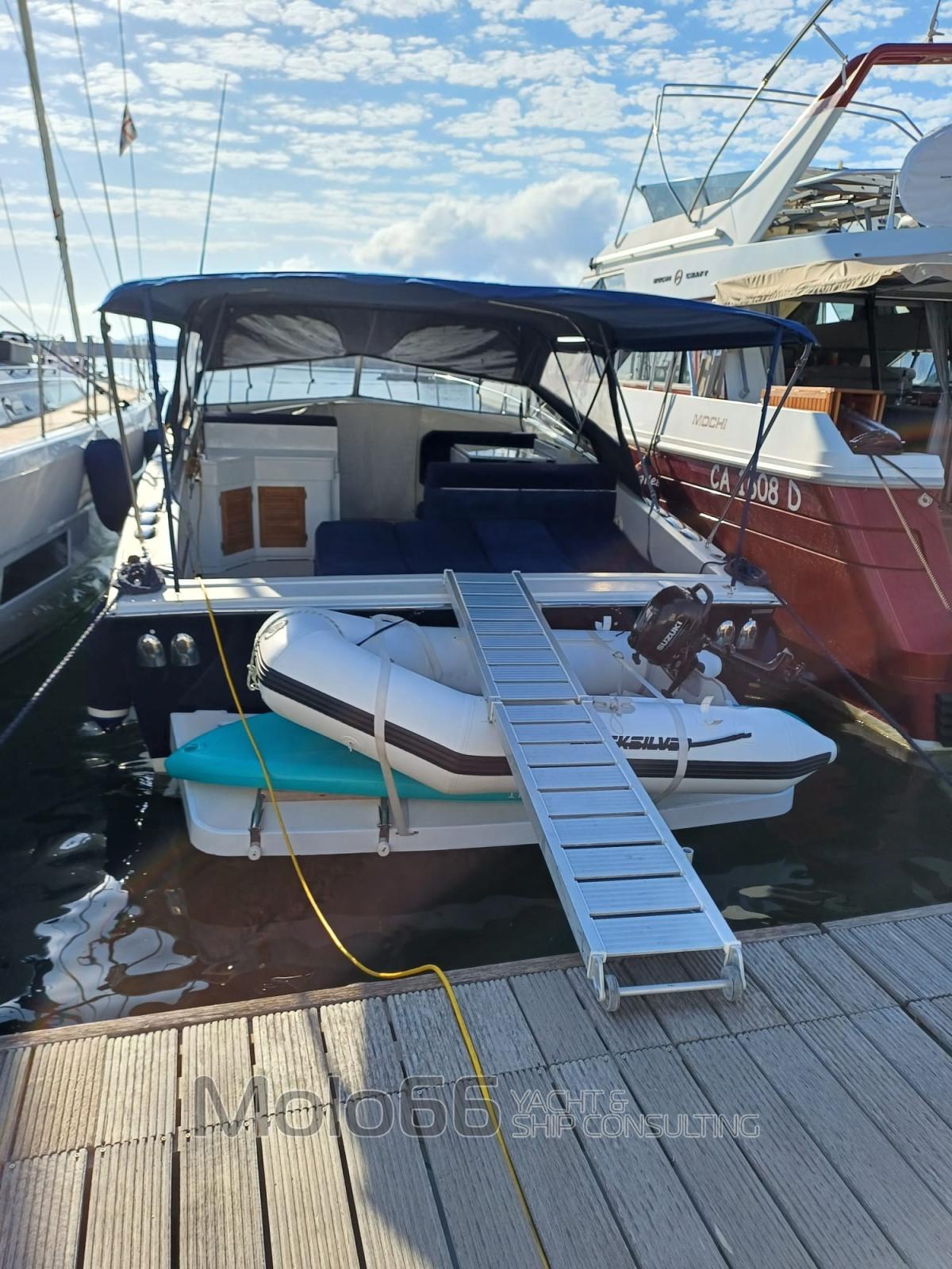 Allarme fumo/gas, Allarme motore, Allarme sentina, Autoclave, 5 Batterie, Doccia esterna, Flap elettrici, Flap idraulici, Impianto antincendio, Indicatori Flaps, Luci di cortesia, Passerella, 3 Pompa di sentina elettrica, Presa 220V banchina, Presa acqua banchina, Salpa Ancore Elettrico, Scaletta da bagno, Tavolo pozzetto, Tavolo Salone Abbattibile, Tender, Tromba.